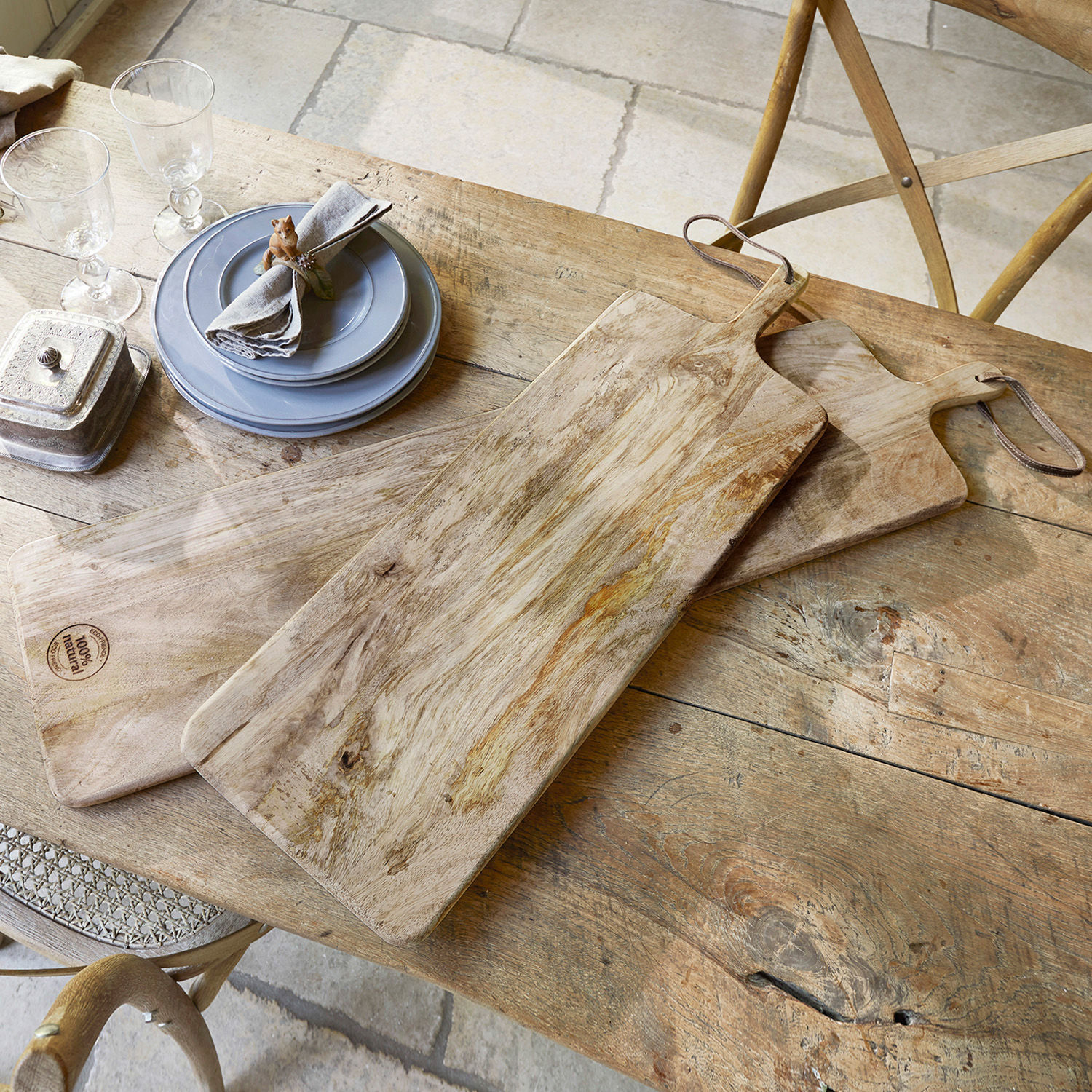 Die beiden langen Schneidebretter wurden aus natürlich schönem Mangoholz gefertigt und in Handarbeit veredelt. Das feine Maserung, sowie die natürliche Farbgebung des Holzes kommen wirklich hervorragend zur Geltung. Darauf können Sie Ihre Lebensmittel hygienisch zubereiten und haben gleichzeitig auch eine wunderschöne Art Sie auf dem Tisch anzurichten. Wer mag, kann diese Schneidebretter auch als Deko an Wänden oder Türen anbringen. Hier können Sie ihrer Kreativität freien Lauf lassen. Beispielsweise lassen sich die Bretter beschriften und als Türschilder verwenden. Auch auf einer Kommode, mit Blüten und Steinen belegt, machen die Schilder eine gute Figur. Aber als Gebrauchsgegenstand in der Küche sind sie nicht nur einmalig, sondern auch äußerst praktisch.