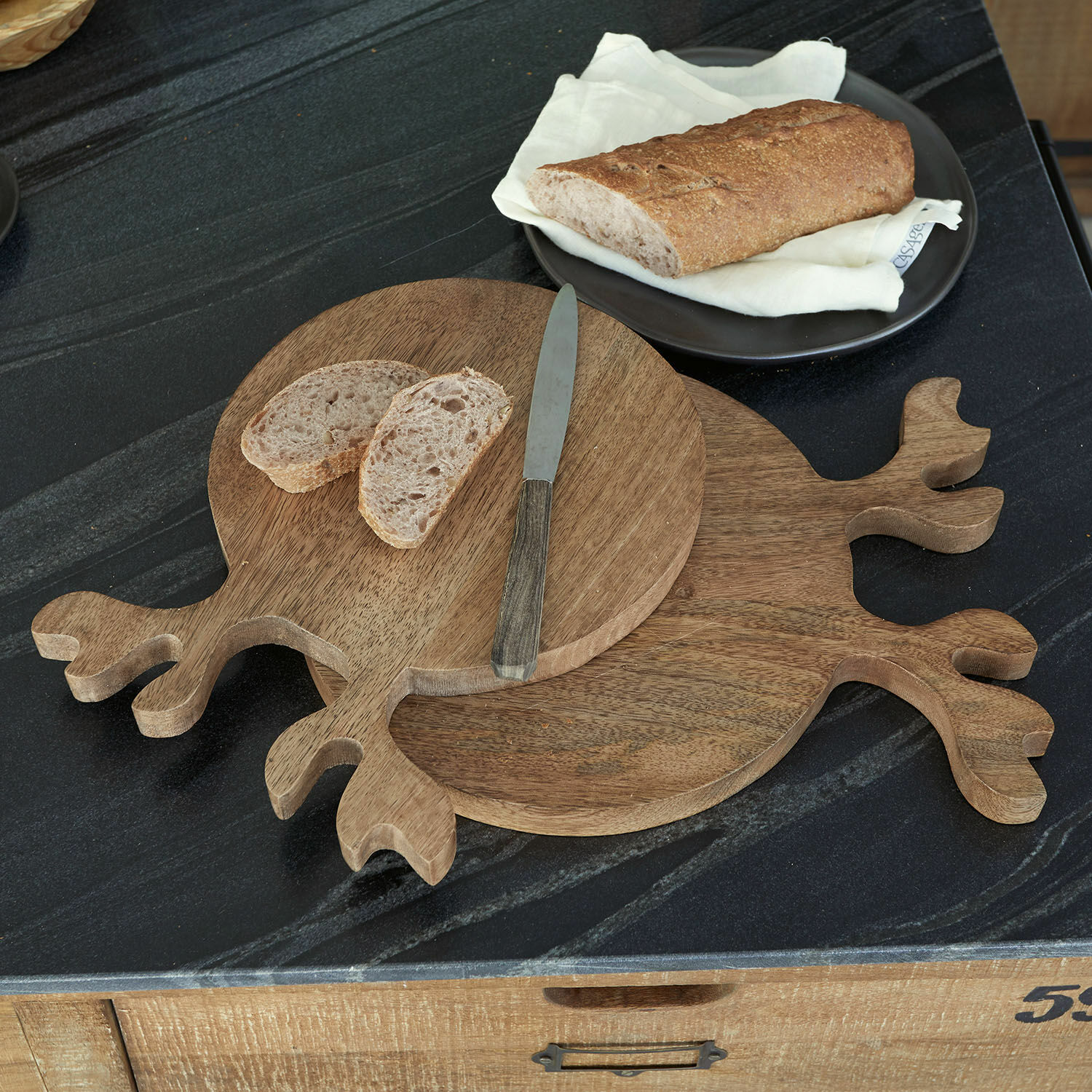Freuen Sie sich auf Natur pur und eine Prise Chalet-Stil. Diese beiden stilvollen Schneidebretter bestehen aus naturbelassenem und schön schimmerndem Mangoholz. Die Maserung, als auch die Farbgebung fallen bei diesem Naturmaterial natürlich sehr unterscheidlich und individuell aus. So wird jedes Brett zu einer Art Unikat. Die Bretter sind mit niedlichen Geweihen am Rand verziert, was für eine sehr freundliche Optik sorgt. An diesen Geweihen können Sie gerne eine Schnur befestigen und die Bretter so an eine Hakenleiste hängen. Das harmonische Set eignet sich bestens zum Schneiden diverser Lebensmittel wie auch zum Servieren oder Dekorieren. Sie könnten darauf Obst und Gemüse, eine Käseplatte oder auch Windlichter und mehr drapieren, ganz nach kreativer Lust und Laune. An diesem stilvollen, nützlichen und naturnahen Doppel haben Sie in jedem Fall das ganze Jahr über Freude.