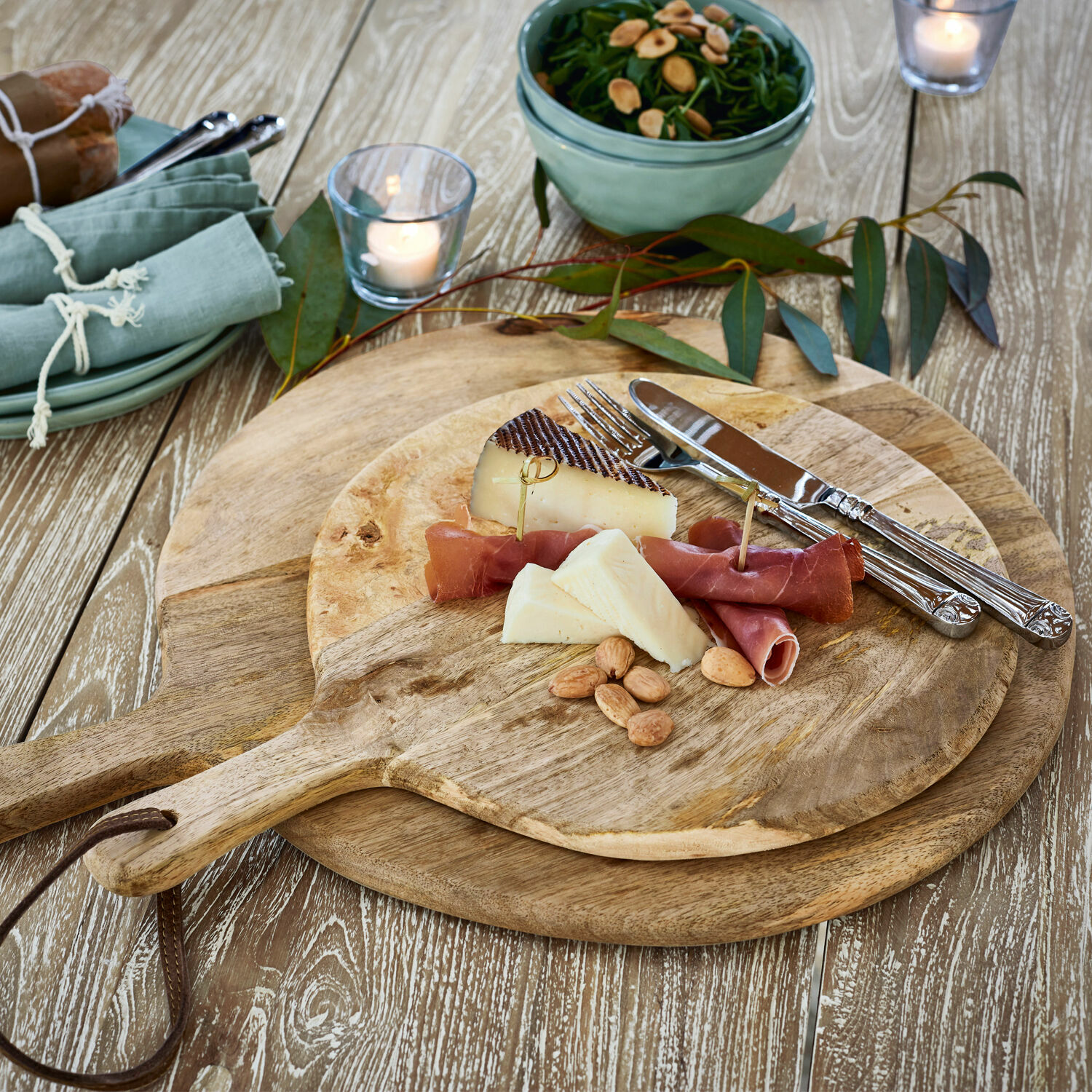 Obst, Gemüse, Brot, Wurst, Fleisch, Zwiebeln, Kräuter – in einer Küche gibt es immer etwas zu schneiden, zu schnippeln, zu putzen und zu hacken. Neben Messern sind deshalb Schneidebretter die am häufigsten eingesetzten Küchenhelfer. Auch für Sie gehört der Griff zum Schneidebrett sicherlich zur täglichen Routine und wird ein besonderes Vergnügen werden, wenn Sie diese zwei Schneidebretter in Ihrer Küche parat haben. Sie sind aus naturbelassenem Mangoholz gefertigt, das als Nebenprodukt des Obstanbaus umweltfreundlich und nachhaltig ist. Außerdem gehört Mangoholz zu den wertvollen Harthölzern, die ordentlich was wegstecken können und durch den jahrelangen Gebrauch in der Küche eher an Charakter gewinnen. Doch das Schneidebrett wird sich nicht nur als praktischer Küchenhelfer bei Ihnen beliebt machen. dank seiner schönen Maserung, die von dem Antik-Finish wirkungsvoll betont wird, eignet es sich auch hervorragend als Präsentationsfläche für Aufschnitt, als Käseplatte und für Brot, aber auch zum Anbieten von Fingerfood, Tapas und anderen kulinarischen Köstlichkeiten, mit denen Sie gerne Ihre Gäste verwöhnen. Nach Gebrauch reinigen Sie das Schneidebrett einfach mit etwas Seifenwasser, lehnen es an die Küchenwand oder hängen es mit dem Büffellederriemen an die Wand.