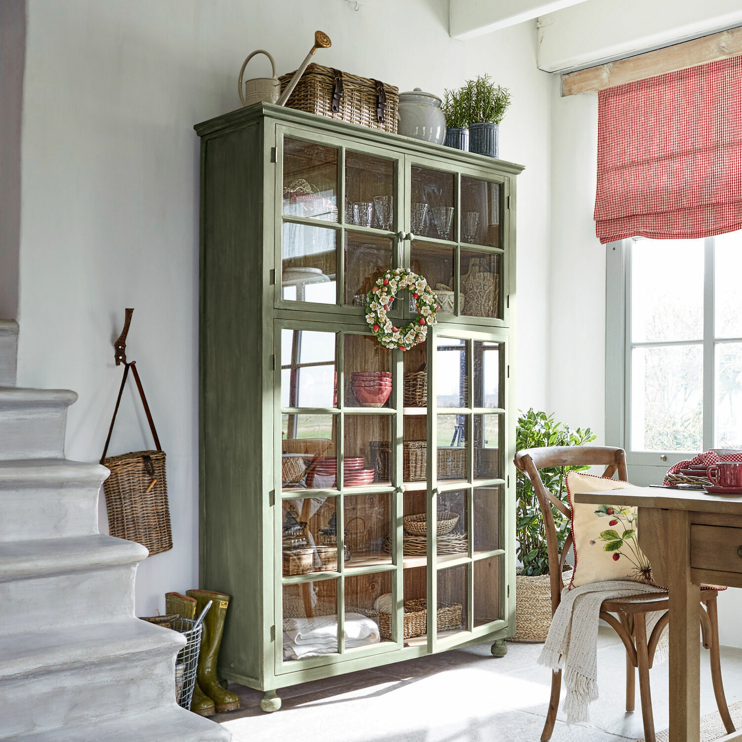Ein helles Grün ist – neben Naturholz und Weiß – seit Jahrhunderten eine beliebte Farbe für Landhaus-Möbel, denn es bringt eine frühlingsfrische Note in unsere Räume. Und wenn diese Farbe dann noch mit klassischen Landhaus-Elementen wie Sprossentüren, Zierleisten und aufwendigen Kranzprofilen kombiniert wird, begegnen wir echten Schmuckstücken traditioneller Handwerkskunst. Wie es dieser Schrank ist, der im beliebten Vitrinen-Stil gefertigt wurde und in seinem Inneren viel Platz für die verschiedensten Dinge bereithält. Alles jederzeit gut zu sehen, aber hinter den Glastüren sicher vor Staub geschützt. Dekoratives Detail ist das feine Wechselspiel zwischen dem Naturton im Inneren und dem altgrünen Farbton außen, der mit den dezenten Gebrauchsspuren den antiken Charakter des Schranks betont. Gerne wird ein solcher Schrank im Esszimmer platziert, wo dann Geschirr und Gläser, geliebte Erinnerungsstücke und vieles mehr in den großzügigen Fächern verstaut werden können. Sollten Sie aber noch nicht zu den Digital Natives gehören und die Haptik echter Bücher schätzen, eignet sich der Schrank natürlich auch perfekt für die Aufbewahrung Ihrer bibliophilen Kostbarkeiten. Und wird dann sicherlich eher einen Platz im Wohnzimmer, im Büro oder der Bibliothek einnehmen.