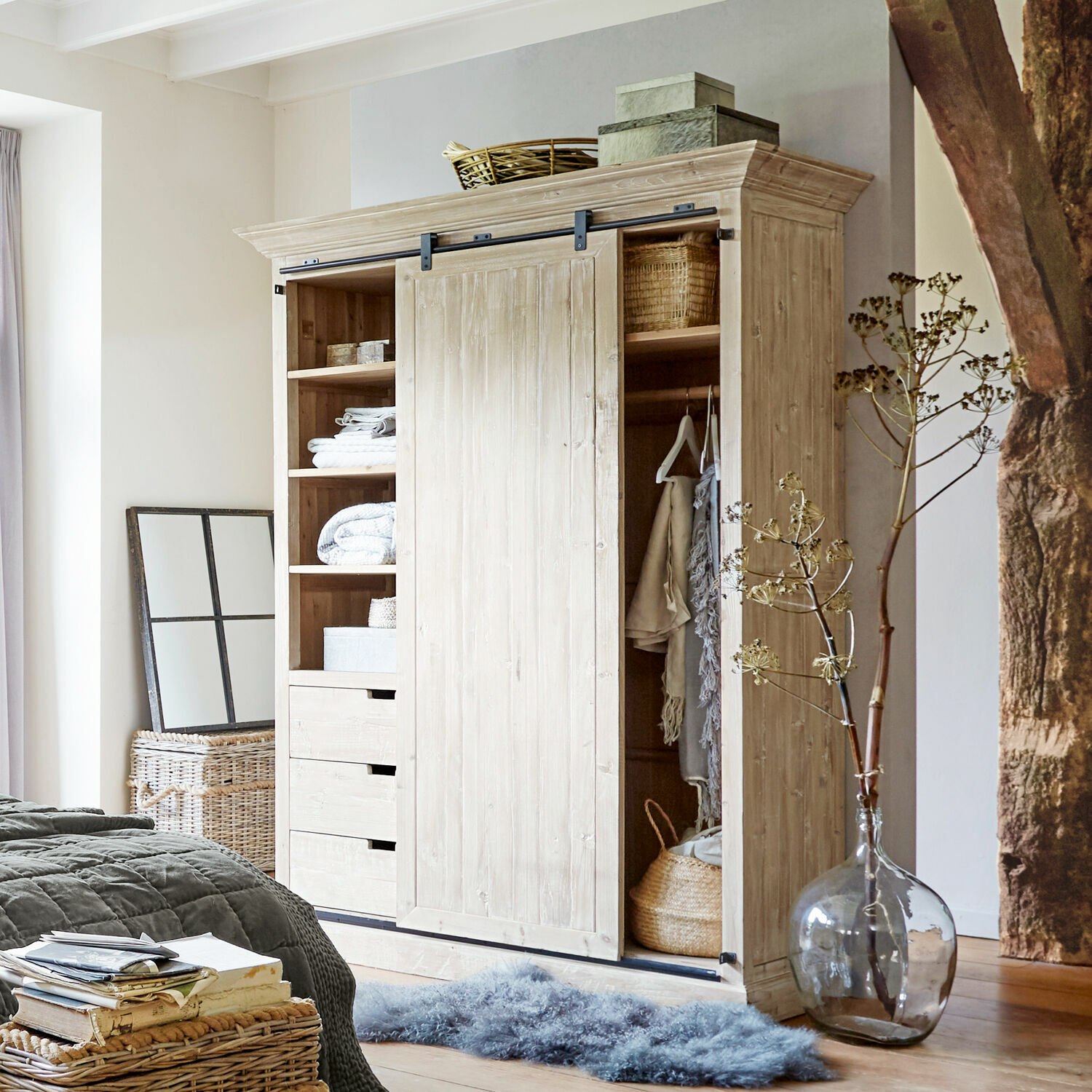 Das Faszinierende am Landhaus-Stil: Er ist überraschend facettenreich. Mal nobel wie in einem alten Schloss, mal rustikal wie in einer Berghütte. Aber immer authentisch und aus schönen Naturmaterialien. Dieser Schrank ist aus wiederaufbereitetem Tannenholz gefertigt und zeigt die gelungene Symbiose aus traditionell-rustikalen und modern-frischen Elementen und fügt sich auf diese Weise in die verschiedensten Wohnsituationen. Das heißt: er passt ebenso gut in ein stilvoll eingerichtetes Anwesen auf dem Land, er verbreitet gemütliches Landhaus-Feeling aber auch in einer Stadtwohnung oder sogar im Loft. Das gelingt dem Schrank in erster Linie durch die natürlich schöne Ausstrahlung des Holzes, dessen charakteristische Maserung durch das antikweiße Finish dezent betont wird, während es zugleich eine frische Note im Raum verbreitet. Wo auch immer dieser Schrank seinen Platz findet, wird er das Wohnambiente mit seiner Persönlichkeit beeinflussen. Und Ihnen das Leben ein wenig leichter machen, denn in seinem Inneren ist viel Platz für Ihre Garderobe. Er bietet Ihnen ein hohes Schrankteil für alles, was Sie aufhängen möchten. daneben befinden sich vier offene Fächer, in denen die kostbaren Kaschmirpullover und Co griffbereit aufgestapelt liegen und in den drei Schubladen werden Wäsche, Strümpfe, Tücher und ähnliches untergebracht. Wenn nur wenig Platz im Schlafraum ist, wird sich die leichtgängige Schiebetür als besonders praktisch erweisen, die sicher an der gusseisernen Schiene geführt wird.