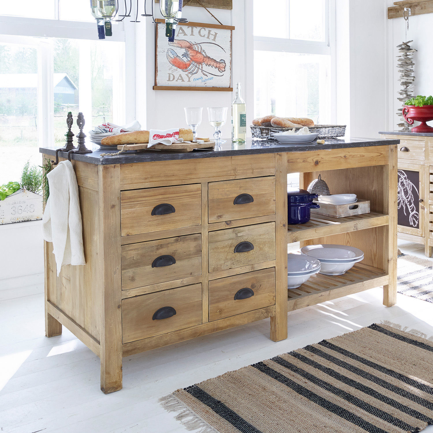 Der naturfarbene Schrank aus recyceltem Kiefernholz überzeugt mit einer hochwertigen Verarbeitung, besten Materialien und einem zeitlos-schönen Design. Die warme Farbe und die sichtbare Maserung des Holzes im Vintage-Look verbreiten einen ganz natürlichen Charme. Im spannenden Kontrast zum Korpus steht die schwarze Natursteinplatte, die nicht nur mit zeitloser Schönheit, sondern auch mit besonderer Widerstandsfähigkeit überzeugt. Darunter verfügt der stabile Schrank über sechs großen Schubladen und zwei offene Staufächer für Geschirr oder Vorräte.