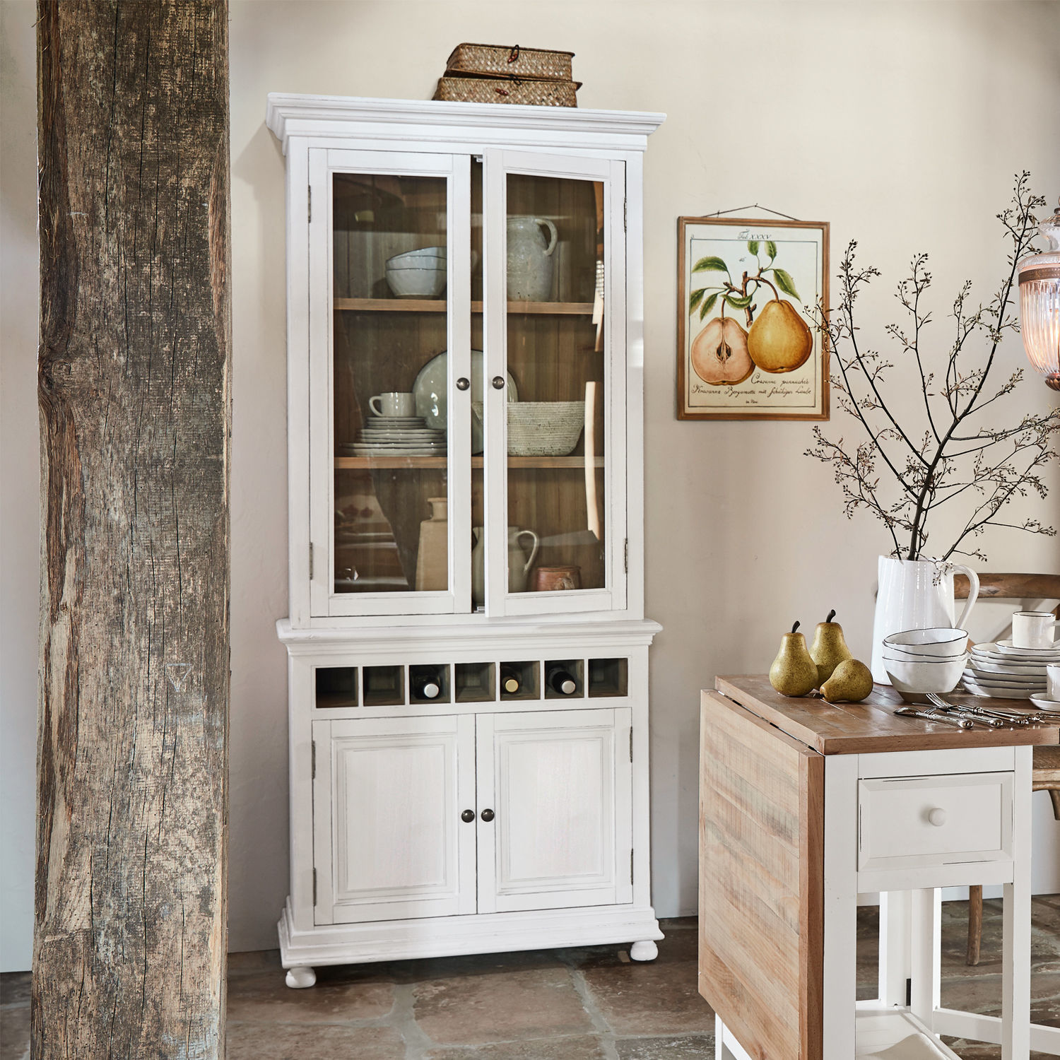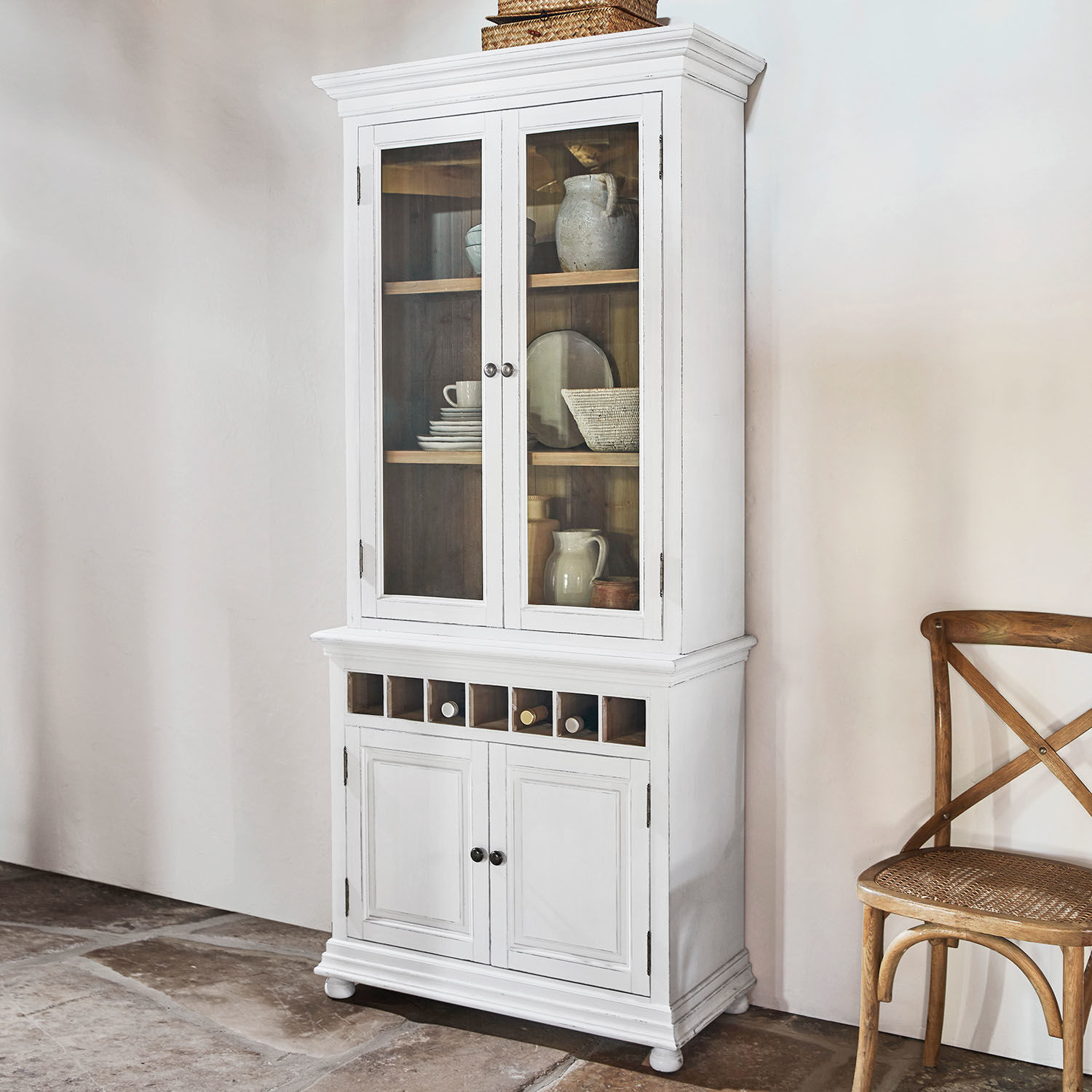 Eine stilvolle Bereicherung für jedes Landhaus, aber auch jedes andere Wohnambiente, das im großen Stil mit französischer Designkunst kokettieren möchte: Der schöne Buffetschrank im Antik-Finish unterstreicht, dass Eleganz und Funktion harmonisch vereinbar sind, ebenso wie schlichte Eleganz mit liebevollen Raffinements. Schöne Kassettentüren, praktische Flaschenfächer und klassische Landhausdekorleisten prägen seine wundervolle Optik. Hinter den Glastüren kommen stilvolle Weingläser, Kelche oder andere schmucke Gegenstände exzellent zur Geltung, die Sie einfach entnehmen, um die Tafel für Ihre Gäste zu schmücken. Doch egal, mit was Sie diesen Blickfang füllen, dieser außergewöhnliche Schrank verleiht Allem den perfekten Rahmen – mit einem Hauch Nostalgie.