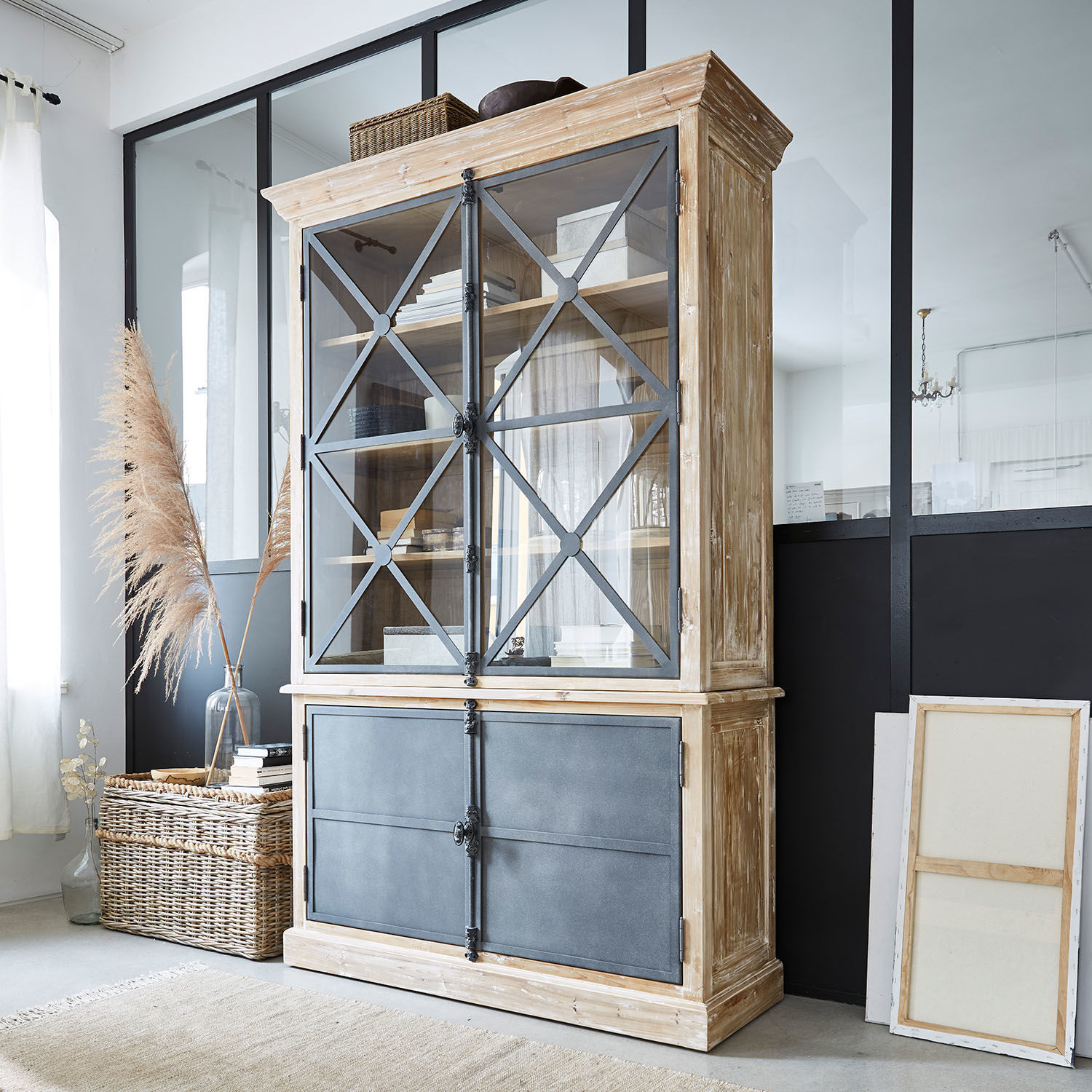 Was Möbelbauer vor 100 Jahren noch entschieden von sich gewiesen hätten, ist heute absolut Trend: der Mix verschiedener Stilrichtungen. Denn die Kombination aus Tradition und Moderne, aus alten und neuen Stilelementen führt oft zu Möbelpersönlichkeiten mit einer faszinierenden Ausstrahlung. Sie wollen ein Beispiel? Bitte sehr, hier ist es. Dieser Schrank besteht zu wesentlichen Teilen aus massivem Tannenholz, das mit seiner markanten Maserung, dem aufwendigen Kranzprofil und dem antikbraunen Farbton mit White-Washed-Finish ganz in der Tradition klassischer französischer Landhaus-Möbel steht. Auch die Glastüren der Vitrine, die mit kunstvoll gearbeiteten Kreuzstreben geschützt werden, sind ein bei vielen Landhaus-Schränken beliebtes Stilelement. Die komplett aus Metall gefertigten Türen im unteren Schrankteil aber verströmen eindeutig den rauen Charme von Möbeln, die in Werkstätten und Industriehallen im Einsatz waren. Ebenso wie der sichtbare Schließmechanismus der Türen, der das Factory-Flair unterstreicht. Und ist der Stil-Mix bei diesem Schrank auch neu und aufregend, die Qualität der Handwerksarbeit ist so hochwertig wie anno dazumal. Ein Schrank mit Persönlichkeit, der das Zeug hat, auch noch Ihre Enkel zu begeistern. Nicht zuletzt, weil es sich bei dem Holz um wiederaufbereitetes Holz handelt, das nicht nur mit seiner lebendigen Ausstrahlung begeistert, sondern auch den Vorteil der Nachhaltigkeit hat.