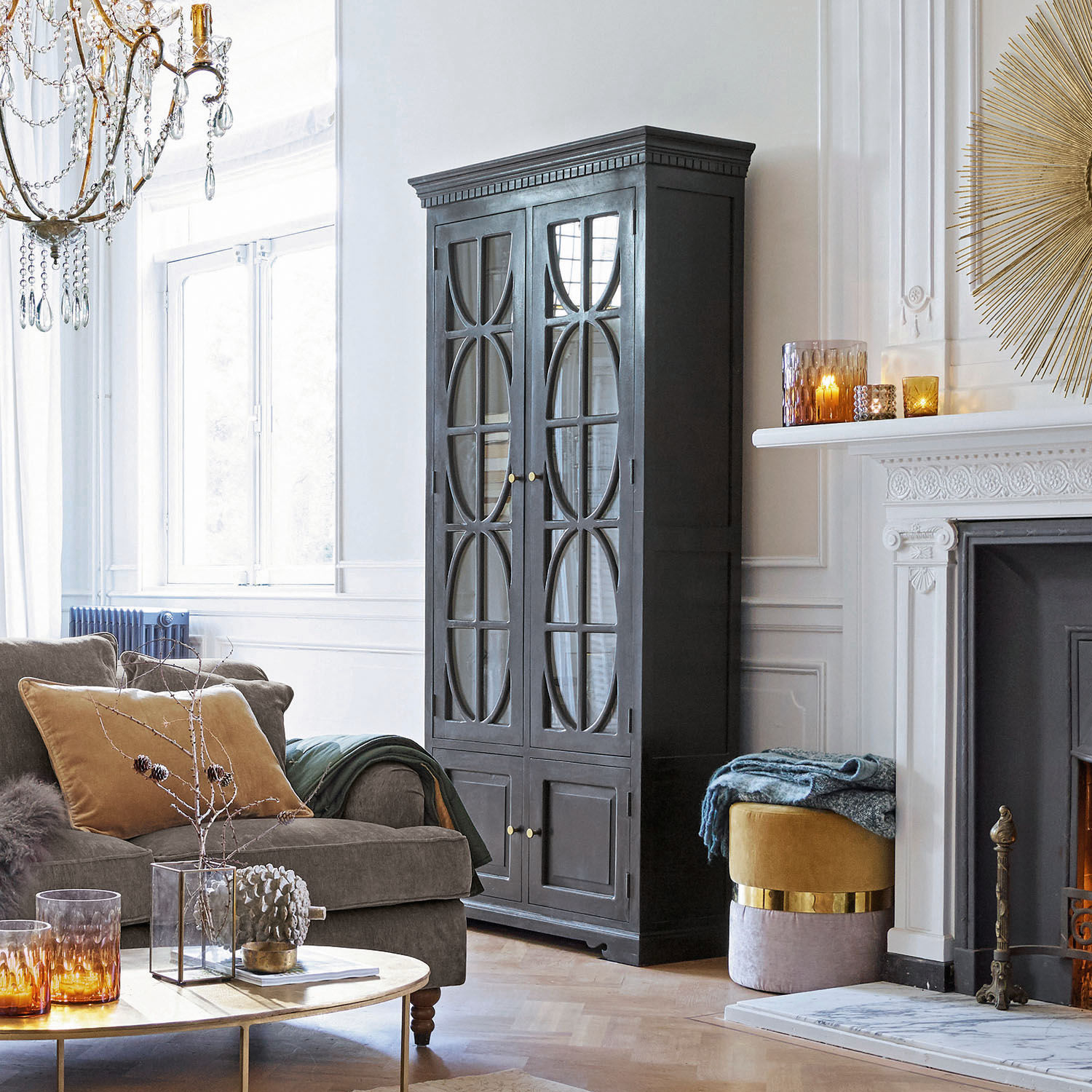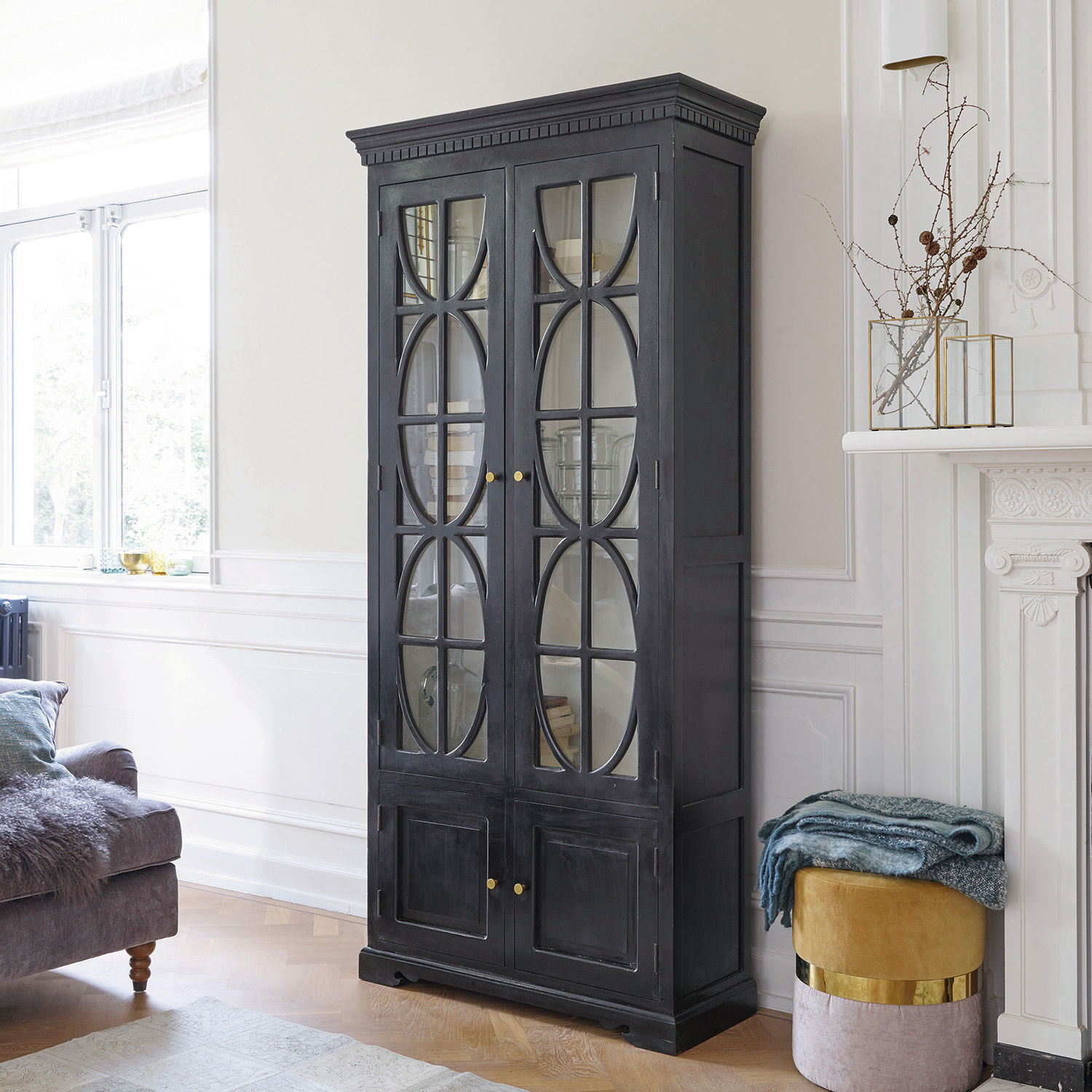 Als hätte er schon vor 100 Jahren in einem vornehmen Salon oder eleganten Speisezimmer gestanden und könnte so manche spannende Geschichte erzählen, deren Zeuge er wurde. Dieser Vitrinen-Schrank steht ganz in der Tradition klassischer Möbelkunst, bei der edle Hölzer und sorgfältige Verarbeitung Hand in Hand gehen. Ob es das massive Mangoholz ist oder Verarbeitungsdetails wie die handgeschnitzte Kranzleiste, die Sprossentüren, die geschlossenen Fächer mit dem Kassetten-Design oder der schön gearbeitete Sockel – hier wurde an nichts gespart und alles mit der gleichen Kunstfertigkeit bearbeitet. Die Sprossenoptik an den Glastüren lebt von dem gekonnten Zusammenspiel von klassisch strengen und elegant geschwungenen Elementen und kommt durch den markanten Kontrast der dunklen Außenfront zur hellen Innenverkleidung besonders schön zur Geltung. Hinter den Glastüren finden edles Porzellan und Gläser ihren Platz, aber auch alte Bücher und andere wertvolle Sammlerstücke sind auf den festen Einlegeböden sicher und staubgeschützt untergebracht. In den geschlossenen Fächern können gut feine Tischwäsche oder andere Accessoires, die Sie gerne griffbereit haben möchten, verstaut werden. Alle Türen haben einen praktischen Magnetverschluss. Der stattlichen Höhe von 220 cm steht eine nur geringe Tiefe von 40 cm gegenüber, so dass sich der Schrank in viele Wohnsituationen einfügen lässt.