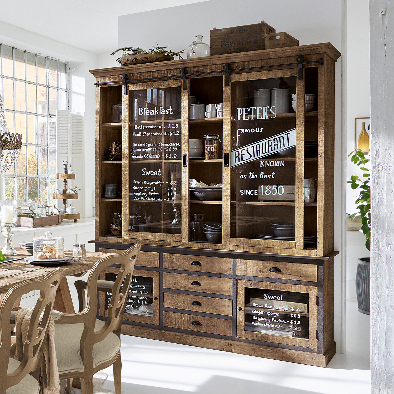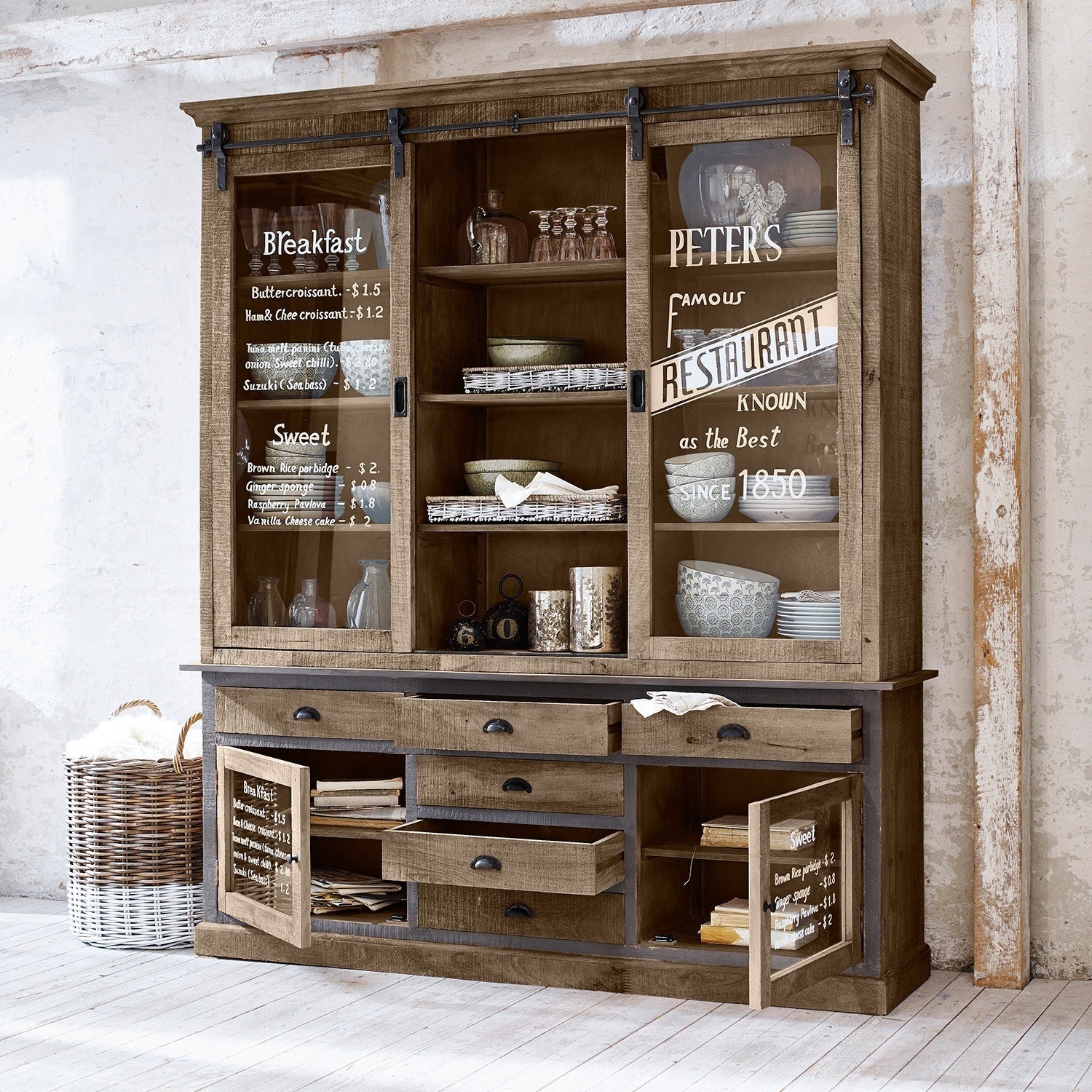 Sie bevorzugen Möbel mit Alleinstellungsmerkmal? Dann werden Sie diesen handgefertigten Schrank lieben, denn einzigartige Details bietet er gleich im Dutzend. Beim Holz geht es schon los, denn es handelt sich um naturbelassenes Mangoholz, das mit einem schonenden Antik-Finish veredelt wurde. Für die feine Struktur und die attraktive Maserung ist diese Behandlung äußerst förderlich. Weiter geht es mit zwei verglasten Schiebetüren, die das Auge mit bezaubernden Vintage-Prints erfreuen. Es scheint so als hätten sich die Designer in die Frühstückskarte eines traditionellen Restaurants verliebt. Gleich zwölf geräumige Ablagefächer verbergen sich dahinter und direkt darüber sitzt eine offene Schiebemechanik aus dunklem Eisen – eine pfiffige und vor allem attraktive Konstruktion, die man nicht alle Tage sieht. Im unteren Drittel sind sechs Schubladen mit bezaubernden Muschelgriffen sowie zwei kleine, verglaste Türen integriert. Hier haben wir es also nicht nur mit einem besonders ansehnlichen, sondern auch mit einem äußerst geräumigen Schrank zu tun.