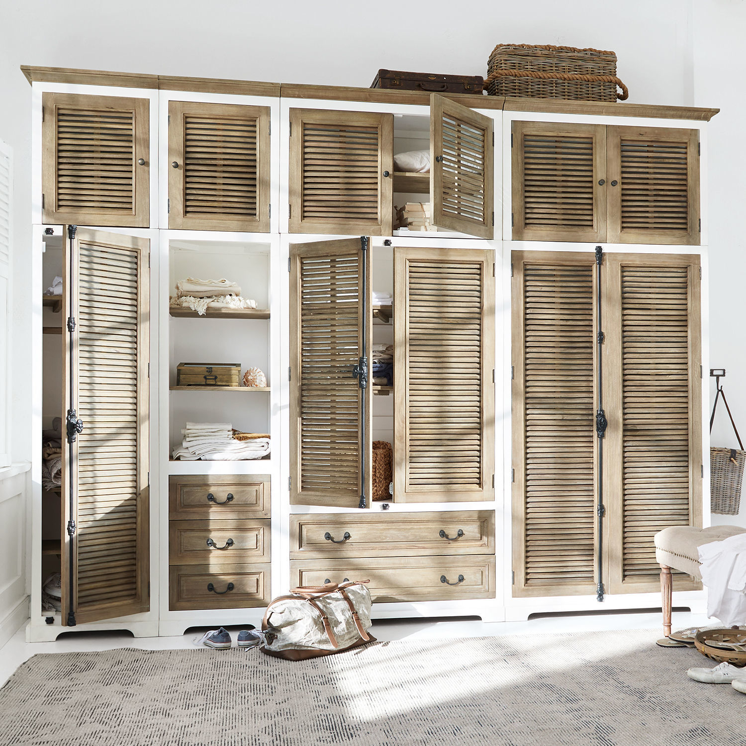 Ein Ensemble wie es im Buche steht. Diese Kleiderschrank-Kombination im französischen Landhausstil ist Vollendung in Form und Funktion. In liebevoller Handarbeit gefertigt besticht das Set durch seine ruhige Eleganz in Mangoholz und schlichter Klarheit seiner Elemente und Optik. Hier findet alles seinen Platz, geordnet und übersichtlich. Hängen Sie Blusen, Westen, Jacken, Hemden und Anzüge an die Kleiderstangen im Inneren, verteilen Sie Schals, Strümpfe und Mützen in die zahlreichen Schubladen. Und auf Ihre Shirts und Pullis warten zahlreiche Ablagefächer. Das Schranksystem ist modular aufgebaut, seine Einzelteile lassen sich unterschiedlich kombinieren. So können Sie das gesamte Ensemble als große Schrankwand nutzen, aber auch einzelne Elemente oder Verbindungen im Raum platzieren – je nachdem, wie viel Platz Sie an den jeweiligen Wänden zur Verfügung haben. Auch lassen sich, sollten sich Ihre Wohnverhältnisse einmal ändern, Elemente entnehmen. So können Sie beispielsweise die zusätzlichen Schrankaufsätze ganz einfach entfernen. Denn die Kranzleiste und die Sockelleiste sind abnehmbar, beziehungsweise lässt sich jedes Element mit den Leisten umschließen, so dass nie der Eindruck der Unvollständigkeit entsteht. Egal, wie Sie Ihr Schrankensemble gestalten: In jedem Fall verspricht das wunderschöne Ensemble durch seine Türen mit der typischen, stilvollen Lamellenstruktur hohe Beständigkeit und Langlebigkeit, denn das Mangoholz ist sehr robust und widerstandsfähig – und zudem sehr pflegeleicht. Das Schrank-Set besteht aus zwei Doppeltür-Elementen (19350 und 1935), die mit zwei mal dem gleichen Schrankaufsatz (19354) nach oben aufgestockt werden können, sowie zwei schmalen, hohen Schränken (19352 und 19353), die ebenfalls mit Schrankaufsätzen (19355) erweitert werden. Stellen Sie die Einzelteile wie gewünscht zusammen oder stellen Sie sie einzeln auf – wie es Ihnen beliebt.