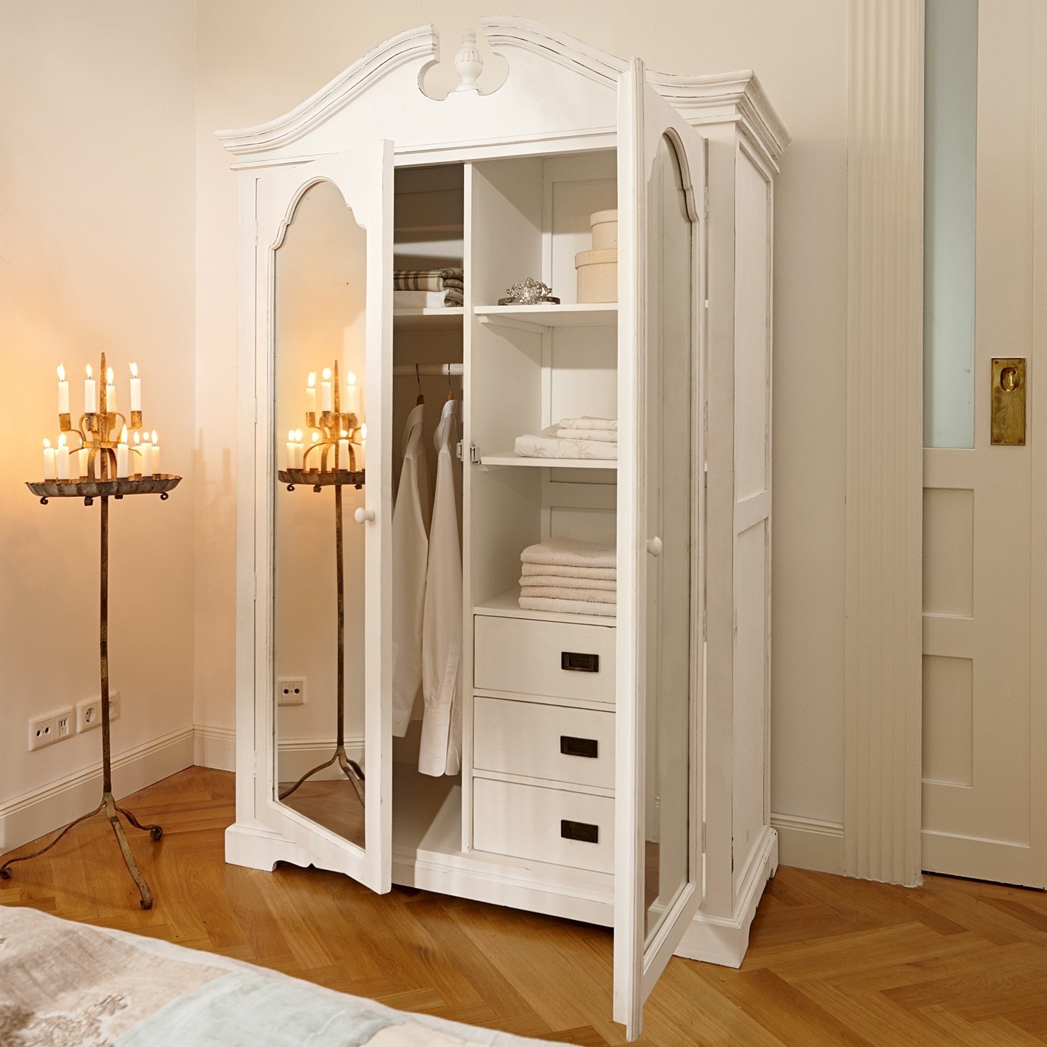 Zwei Türen ins Märchenland: Der handgefertigte Kleiderschrank besticht mit einem romantischen Design und einem Vintage-Finish in Antikweiß. Im Inneren verbergen sich eine Kleiderstange, vier Ablagefächer und drei Schubladen – genug Platz für Roben und Gewänder für jeden Anlass. Zum Schrank passt ein Bett im Landhaus-Stil mit einem üppig gefüllten Federbett, Accessoires in Weiß, Creme und Gold, sowie bodenlange Nachthemden. Das Ergebnis ist eine Schlafzimmereinrichtung in der Sie garantiert märchenhaft nächtigen.