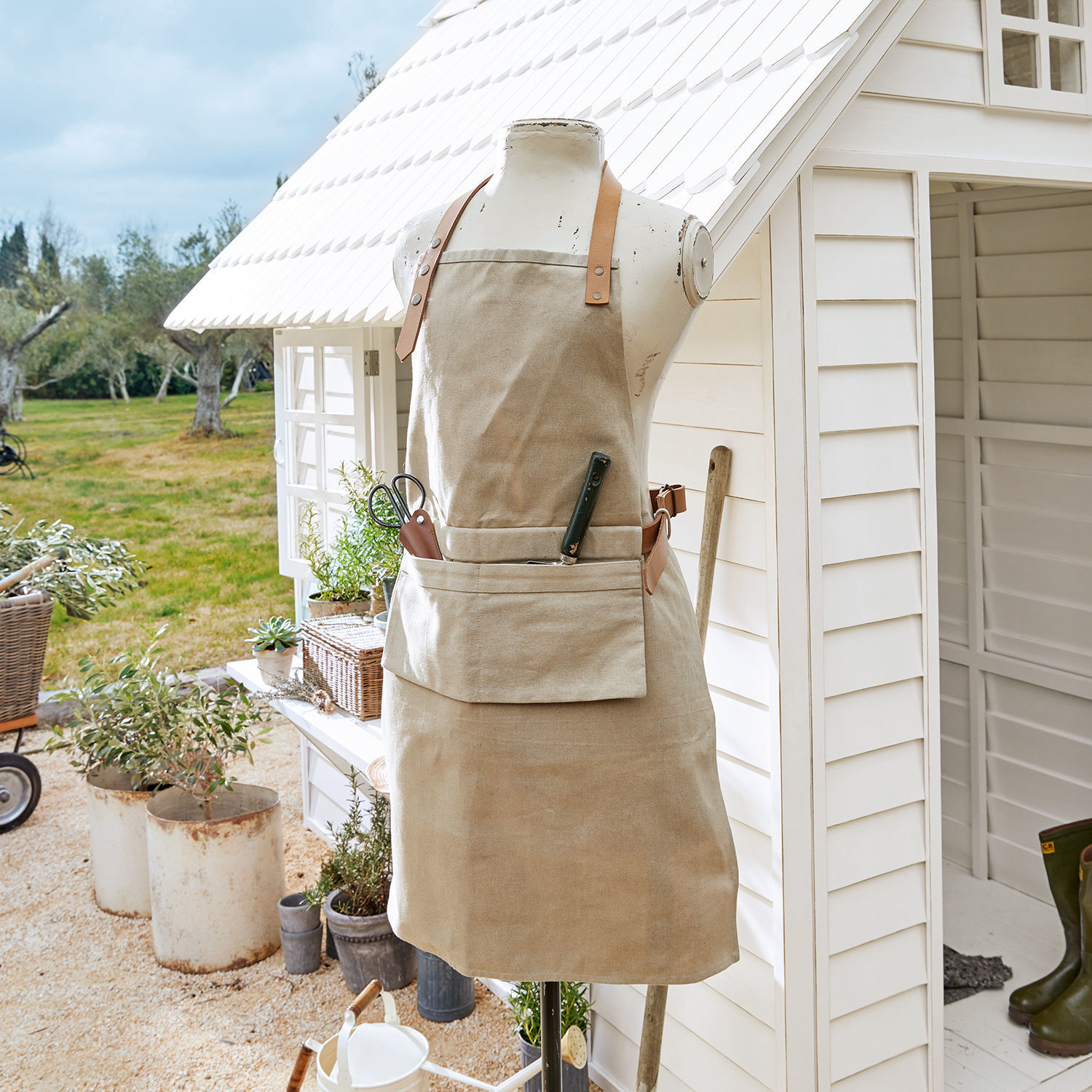 Gartenarbeit kann so viel Freude bereiten. In grüner Natur bietet sie einen perfekten Kontrast zum grauen Büroalltag und kann sogar wunderbar entschleunigend wirken. Diese Schürze aus strapazierfähigem Baumwoll-Canvas steigert das Vergnügen noch um ein Vielfaches. Puristisch im Design und praktisch in der Detailausstattung vereint sie perfekt Funktion und Ästhetik. Die markanten Gurte sind aus edlem Büffelleder gearbeitet – sie lassen sich im Halsbereich durch Druckknöpfe und im Rumpfbereich durch eine Schließschnalle regulieren. Auch eine zweigeteilte Fronttasche gehört zum Repertoire dieser Gartenschürze. So haben Sie nötige Werkzeuge und Utensilien mit einem Griff zur Hand, was Ihnen die Arbeit beispielsweise auf der Leiter zusätzlich erleichtert. Ein unverzichtbarer Alltagsbegleiter, der nicht nur im Garten, sondern auch beim Grillen eine gute Figur macht.