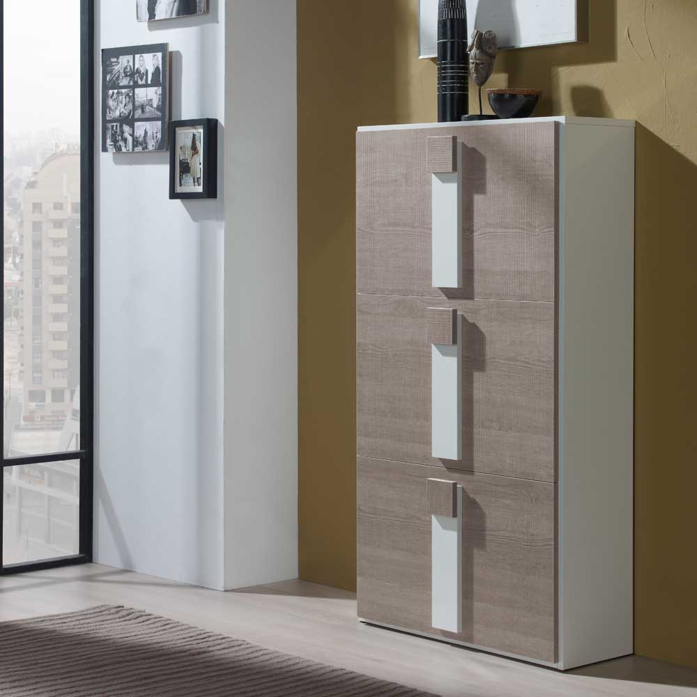 – Schuhschrank Weiß und Sonoma-Eiche – Schuhkipper MDF – Schuhständer Modern – Schuhkommode Breite: 65 – Schuhklapper Höhe: 117 – Schuh schrank Tiefe: 28 – Kommode für schuhe Modernem Hochglanz – Schuhschrank hochglanz Ohne Beleuchtung – Hochglanzschuhschrank Fertig montierte Anlieferung (eventuell müssen noch Kleinteile angebracht werden) – Garderobenschuhschrank Sockelgestell – Lackiert – Holzgriffen – Drei Klappen, mit Platz für insgesamt 24 Paar Schuhe – Rechteckige Form