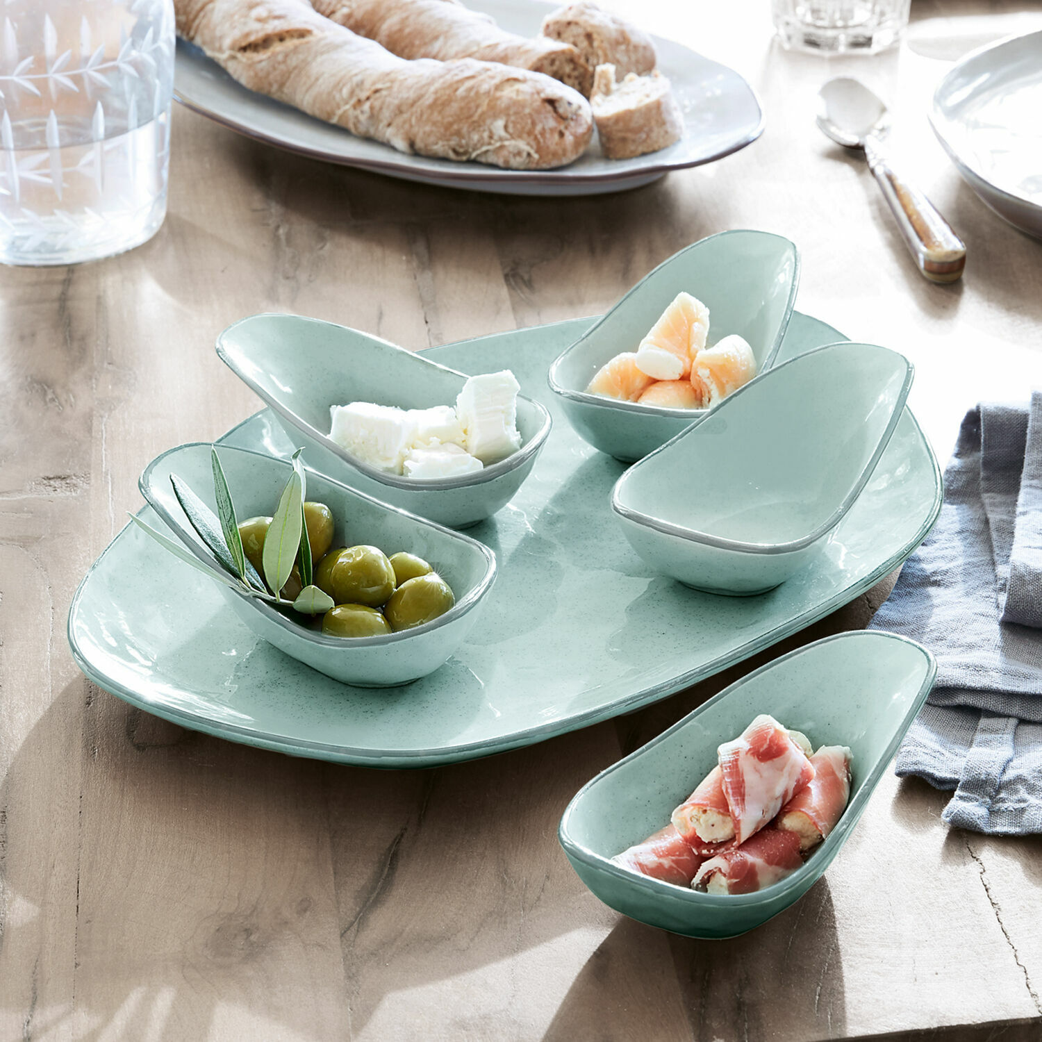 Ganz gleich, ob sie ihren Gästen einen kleinen Gruß aus der Küche senden oder Dips und Saucen besonders stilvoll anrichten möchten – dieses sechsteilige Set ist dafür prädestiniert. Es besteht aus fünf kleinen Schälchen und einem Unterteller. Es handelt sich um hochwertigeS Steingut, das in traditioneller Handarbeit hergestellt wurde. Ein wunderschönes Detail sind die feinen, farbig abgesetzten Ränder, die hervorragend mit dem Grundton kontrastieren. Doch auch der unglasierte Boden ist ein schönes Detail. Präsentieren Sie Ihren Gästen Speisen oder Snacks in wundervoll charmanter Optik. Die unvollkommenen Rundungen und Unebenheiten verbreiten einen besonderen Charme, denn sie beweisen deutlich, dass diese Schälchen in aufwendiger Handarbeit entstehen.