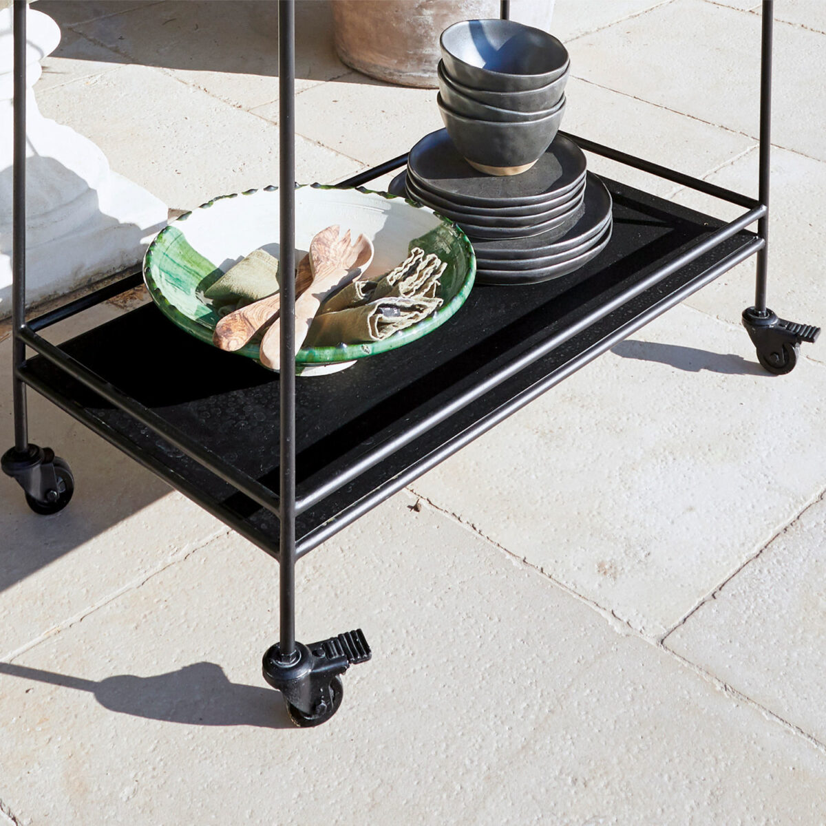 Der ideale Party-Butler: Der vielseitige Servierwagen aus Eisen ist mit seiner puristischen Industrial-Optik eine stabile und attraktive Bereicherung für Ihr Haus. Servieren Sie komfortabel Getränke, Snacks oder gegrillte Köstlichkeiten bei einer Feier mit Freunden und Bekannten. Oder überraschen Sie Ihre bessere Hälfte mit einem Frühstück am Bett. Mit drei Ablageflächen ist der Barwagen bereit für allerhand Leckereien, Geschirr und Besteck. Das mittlere Fach ist mit Zwischenräumen versehen und so bestens für Flaschen geeignet – das sieht nicht nur schick aus, sondern ist auch wunderbar praktisch. Zudem verfügt der Servierwagen über einen praktischen Feststellmechanismus. So können Sie sicher sein, dass er einen sicheren Stand hat und alles griffbereit bleibt. Das ideale Schmuckstück für die Küche, das Esszimmer, Wohnzimmer oder für die Party im Garten.