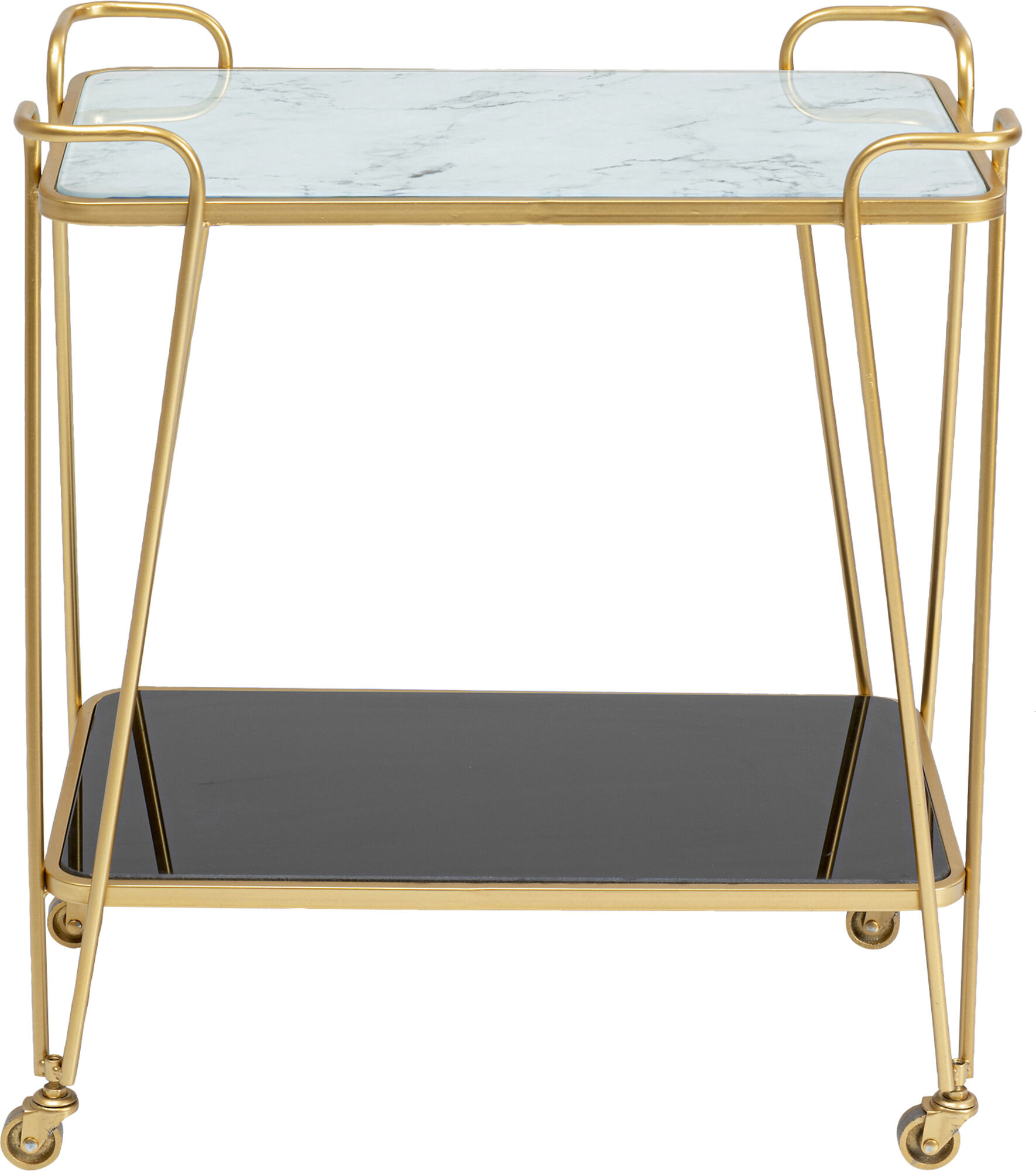 Jeder Tag ein Fest! Ein Barwagen hat etwas herrlich Mondänes, immer bereit, spontanen Besuch zu bewirten. Die Form ist reduziert und eine Hommage an die glamourösen Sixties in Beverly Hills. Außerdem rollt er flexibel durch die Wohnung und ist bei Bedarf in Küche, Schlafzimmer oder Bad als mobiles Regal nützlich – und schick! Material: (Gestell: Stahl lackiert, Rollen: Stahl lackiert, Glas Sicherheitsglas ESG foliert (Platte oben), Glas Sicherheitsglas ESG gefärbt (Platte unten))