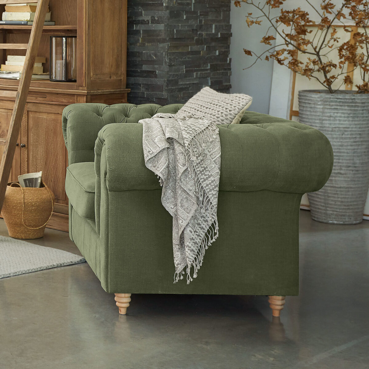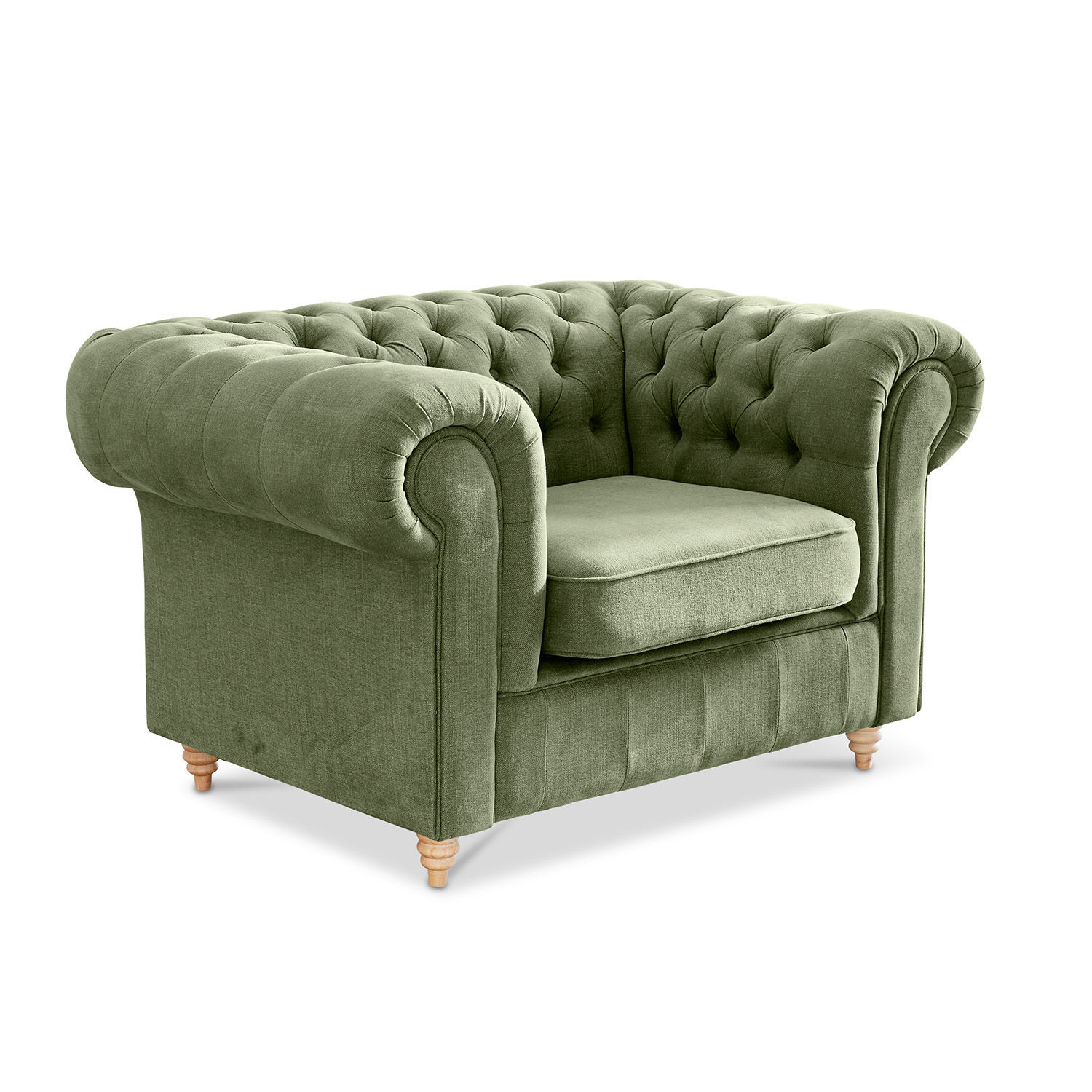 Bald haben Sie jeden Abend ein Date, dem Sie den ganzen Tag entgegenfiebern werden, denn zu Hause wartet Chesterfield auf Sie. Schon sein gepflegter Anblick wird Ihnen jedes Mal Herzklopfen bereiten, erweist sich Ihr “Neuer“ doch von Kopf bis Fuß als ein nobler Vertreter der feinen englischen Lebensart, der eine exklusive Ästhetik mit bestem Benehmen zu verbinden weiß. Ein echter Hochgenuss aber ist das First-Class-Verwöhnprogramm, das Sie jeden Abend genießen dürfen, wenn Sie erschöpft in Ihren neuen Sessel sinken. Die dicken Sitzpolster umfangen Sie komfortabel weich, während die opulenten Rücken- und Armlehnen den Körper sanft stützen und sich der weiche Stoff wie zärtliche Streicheleinheiten anfühlt. Mit diesem Sessel im Chesterfield-Look entscheiden Sie sich für einen Gentleman alter Schule, der zugleich auch Ausdruck bester Handwerkstradition ist. Für die ausgezeichnete Stabilität und den exquisiten Sitzkomfort sind bei diesem Sessel ein solide gearbeitetes Gestell aus massivem Buchenholz verbunden mit einer hochwertigen Schaumstoffpolsterung verantwortlich, während der weiche Bezugsstoff mit allen Vorzügen reiner Naturfasern punktet. Die fein von Hand gedrechselten Füße aus Buchenholz machen den exklusiven Auftritt perfekt. Vervollständigen Sie Ihre Wohnzimmer-Landschaft noch mit dem passenden Sofa mit der Bestell-Nr. 19670.
