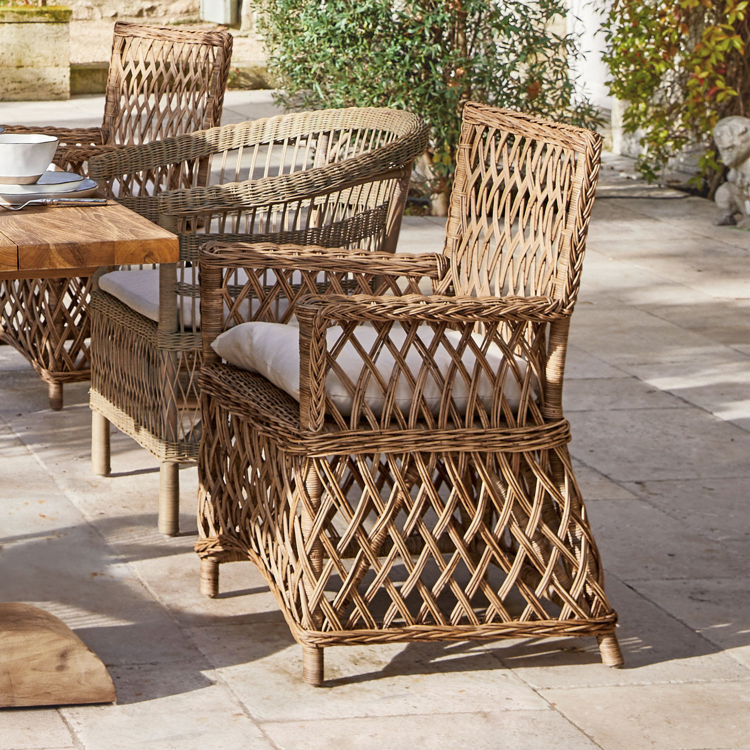 Zugegeben: Rattanmöbel sind unschlagbar gemütlich und strahlen eine anziehende Wärme aus. Doch müssen sie hochwertig gefertigt und natürlich im Material sein. Denn wenn es um Ihren Wohntraum geht, sollten Sie sich nicht mit weniger zufrieden geben. Dieser Sessel aus echtem Rattan greift praktisch alle Vorteile des begehrten Sitzmöbels auf und präsentiert sich dennoch besonders. Sein Korpus aus stabilem Eisen ist mit einem wunderschönen Rautendesign bezogen, das kunstvoll von Hand mit den einzelnen Flechtsträngen verflochten wurde. Eine gelungene Mischung aus Eleganz und Leichtigkeit prägt seinen Auftritt. Erfreulich ist auch der Sitzkomfort: Das fest fixierte Polsterkissen ist mit einem strapazierfähigen Baumwollgewebe bezogen. Auch die Armlehnen sowie die hohe Rückenlehne tragen zur entspannten Bequemlichkeit bei. Ob im Innen- oder Außenbereich – der Korbsessel ist für jede Situation zu haben und wird im Esszimmer oder auf der Terrasse schnell zur ästhetisch wertvollen Sitzgelegenheit. Auch in einem Pavillon oder einer romantischen Gartenlaube kommt der Armsessel wunderbar zur Geltung.