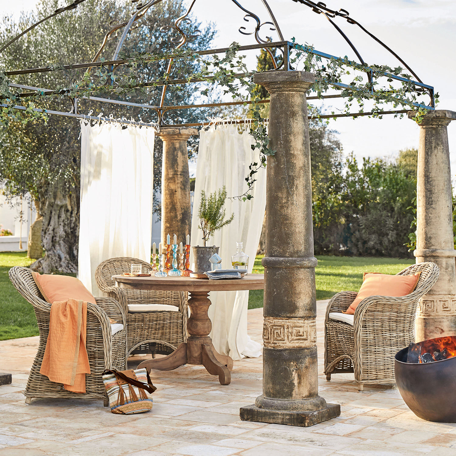 Wer liebt es nicht – das entspannte Lebensgefühl des mediterranen Raumes! Und wo lässt sich das besser genießen als in einem Sessel wie diesem hier? Zumindest während der vielen Sommertage und Abende, die man nicht unter südlicher Sonne verbringen kann. Da aber auch die Sommer nördlich der Alpen mediterranen Charakter annehmen, wird das Urlaubsfeeling auf Ihrer Terrasse perfekt werden. Ganz gleich, ob Sie während der Gartenarbeit mal solo eine kurze Pause in diesem Sessel einlegen oder sich die Freunde um den Tisch versammeln, weil Sie zum traditionellen Barbecue eingeladen haben – alle werden das außergewöhnliche Sitzerlebnis in diesem Sessel zu schätzen wissen. Das hohe Rückenteil lädt zum entspannten Anlehnen ein, während die Arme auf den geschwungenen Armlehnen ruhen – so lässt es sich gemütlich plaudern, bis plötzlich die Sterne am Himmel leuchten. Doch auch, wenn Sie mal keine Zeit zum Platz nehmen haben, wird das elegante Design eine Freude fürs Auge sein. Das dekorative Geflecht sieht aus wie echtes Rattan, ist aber ein modernes Kunststoffgeflecht mit hervorragenden Outdoor-Eigenschaften. Die elastischen Kunststofffasern, die wie Naturrattan in aufwändiger Handarbeit geflochten werden, sind absolut nässe- und wetterbeständig, so dass Sie den Sessel unbesorgt den ganzen Sommer draußen im Freien stehen lassen können.