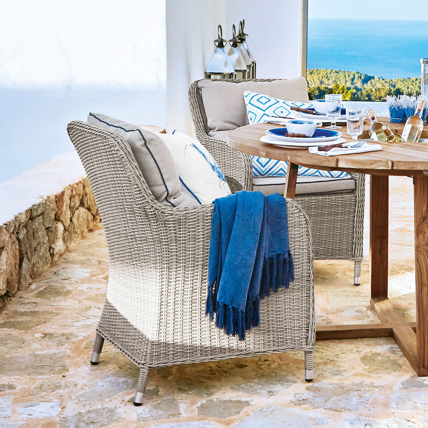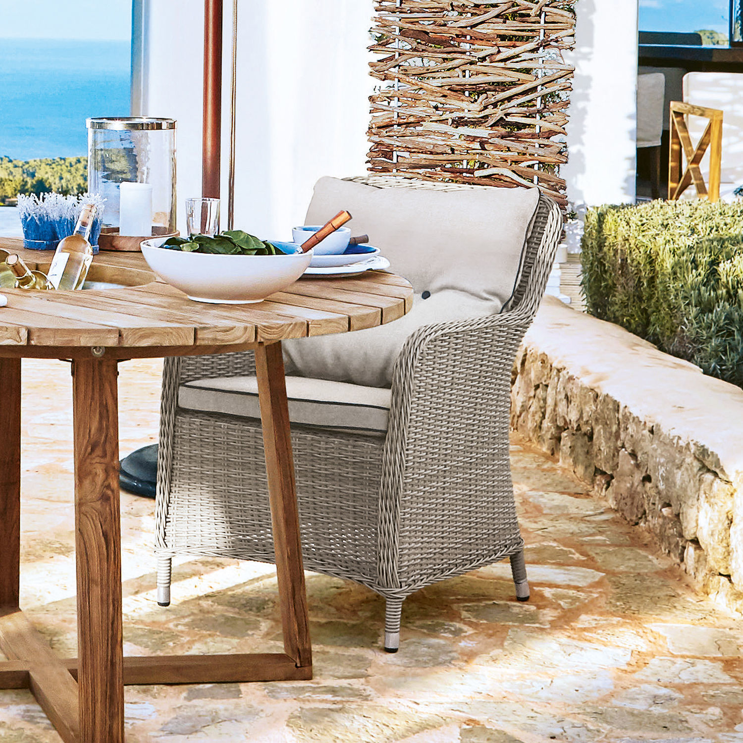 Formschönes und wetterfestes Gestell aus Aluminium und fein geflochtenem Polypropylen. Inklusive Sitzkissen und dick gepolstertem Rückenkissen mit abnehmbaren […]