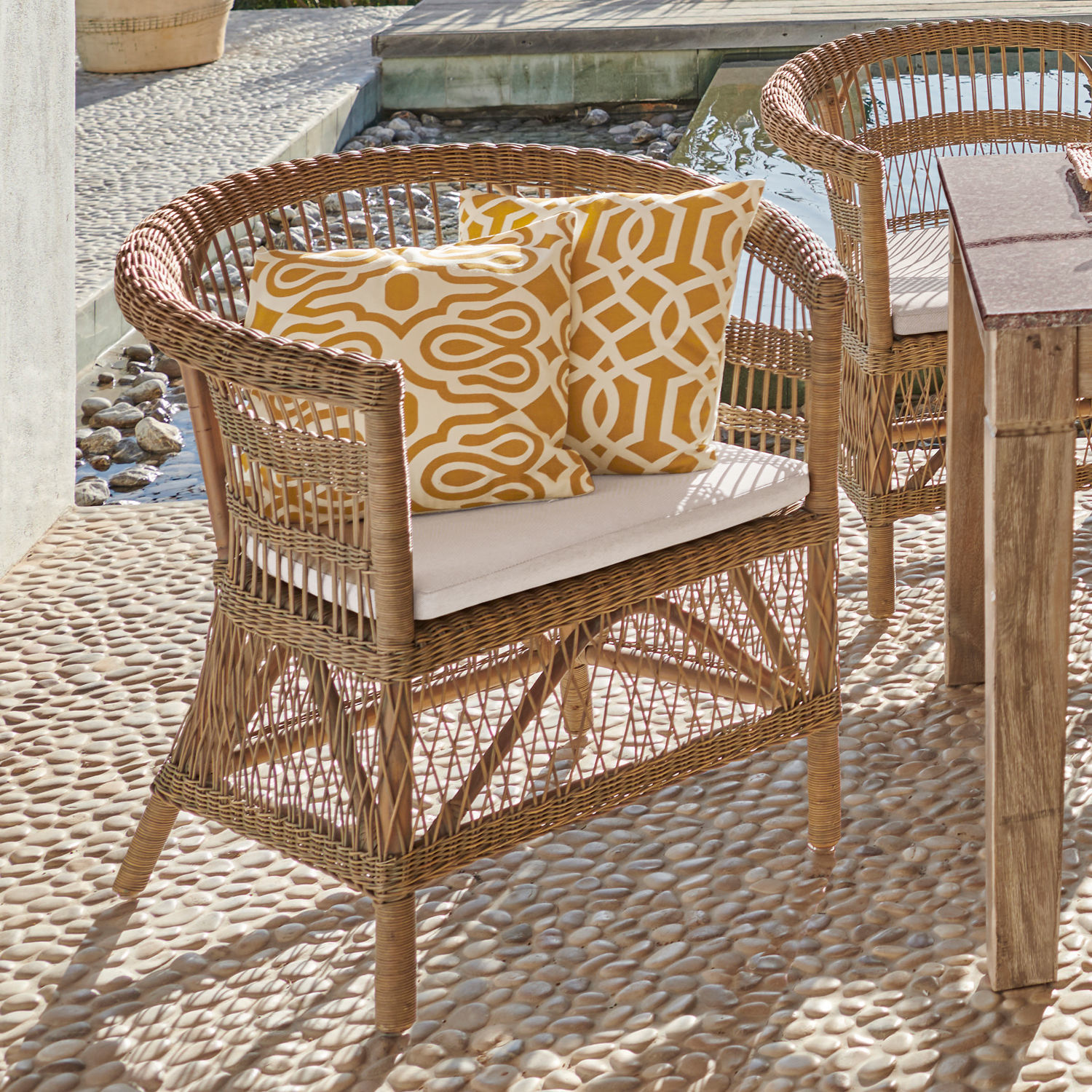 Der Trend zum Nature-Living ist ungebrochen. Und was gehört auf jeden Fall auf eine überdachte Terrasse oder an den Esstisch? Ganz richtig: Ein Stuhl aus natürlichem Rattan, in dem man wunderbar bequem sitzt. Zum gemütlichen Relaxen, zum Plaudern mit Freunden und Nachbarn und natürlich zum Essen. Dieser Sessel wird alle Ihre Wünsche erfüllen – und sogar noch ein paar mehr. Die großzügige Sitzfläche verwöhnt Sie zusammen mit der runden Form und den integrierten Armlehnen mit ausgezeichnetem Sitzkomfort, während das kunstvolle Flechtwerk ein reizvolles Wechselspiel aus offeneren und dichteren Flechtpartien zeigt, die dem Sessel die luftig leichte Ausstrahlung verleihen. Das Besondere aber ist das Material. Für diesen Sessel wurde echtes Rattan von Hand geflochten, denn immer mehr setzen beim Möbelkauf auf Naturmaterialien, vor allem, wenn sie, wie Rattan, den ökologischen Aspekt berücksichtigen. Denn die Lianen-artigen Triebe der Calamus-Palme können im tropischen Regenwald geerntet werden, ohne die Urwaldbäume oder das empfindliche Ökosystem zu stören. Ist Ihr Sitzplatz im Grünen vor Regen geschützt, werden Sie lange die Gesellschaft dieses edlen Sessels genießen können.