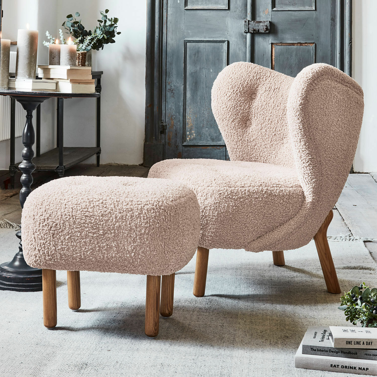 Sieht dieses hübsche Duo nicht einladend aus? Möchten Sie sich nicht einfach in diesen Traum aus weichem Bouclé-Stoff fallen lassen und die Füße auf dem feinen Hocker hochlegen. Was darf es zur Entspannung sein? Ein aufregender Roman, besinnliche Lyrik oder lieber etwas Unterhaltsames im Fernsehen? Klar ist: Mit diesen ebenso schicken wie bequemen Möbeln haben Sie alle Voraussetzungen, um es sich schön zu machen und den Alltag zu vergessen. Der Stilmix aus klassischem Chesterfield mit Vintage-Charme und dem modernen Bouclé-Bezug freut sich auf Sie! Bersonders der Bezug sorgt für Gemütlichkeit. So weich wie Teddy-Fleece, in der Optik eher grob – so präsentiert sich der extra weiche Bouclé-Stoff, der sowohl auf Sessel, als auch auf dem Hocker zu finden ist. Abgerundet werden die beiden Sitzmöglichkeiten durch schön designte Kiefernholz-Füße, die eine natürliche Holzmaserung noch gut erkennen lassen. Eine wahrlich perfekte Liason aus Stil und Komfort!