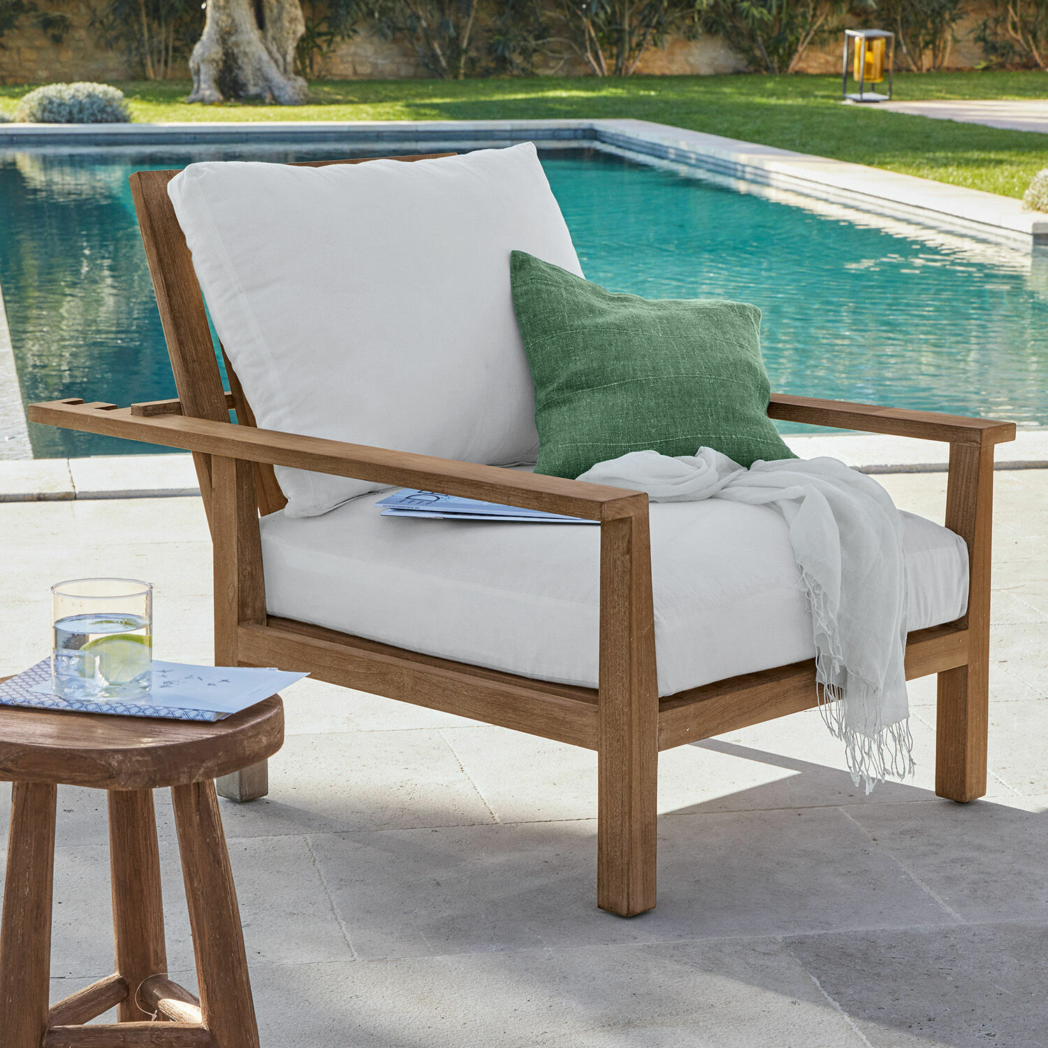 Wenn edle Materialien von einem ambitionierten Handwerker verarbeitet werden, entstehen Möbel von exklusivem Design und ausgezeichneter Haltbarkeit. Und wenn das Ganze noch mit einer innovativen Komponente bereichert wird, haben Sie einen Sessel, in dem Sie viele schöne Sommertage und Abende höchst komfortabel genießen können. Das modern geradlinige Gestell des Sessels besteht aus wertvollem Teakholz, das seit Jahrhunderten wegen seiner Härte und Witterungsbeständigkeit geschätzt wird. Deshalb können Sie den Sessel unbesorgt draußen im Freien stehen lassen, bei heißer Sommersonne wie auch während längerer Regenperioden. Ein echtes Komfort-Detail ist die dreifach verstellbare Rückenlehne, so dass Sie stets genau die Sitzposition wählen können, die Ihnen in diesem Moment am angenehmsten ist. Perfekt wird der luxuriöse Entspannungsgenuss in dem Sessel durch die dicken, relativ fest gepolsterten Kissen. Denn der Bezugsstoff verwöhnt die Haut mit einer Haptik, die an ein Gewebe aus Naturfasern erinnert, es handelt sich aber um robustes Polyester, die auch mal ein paar Regenspritzer aushält. Tipp: Das Maximum an Komfort werden Sie natürlich erleben, wenn Sie Ihre Füße auf den passenden Hocker (20442) legen.