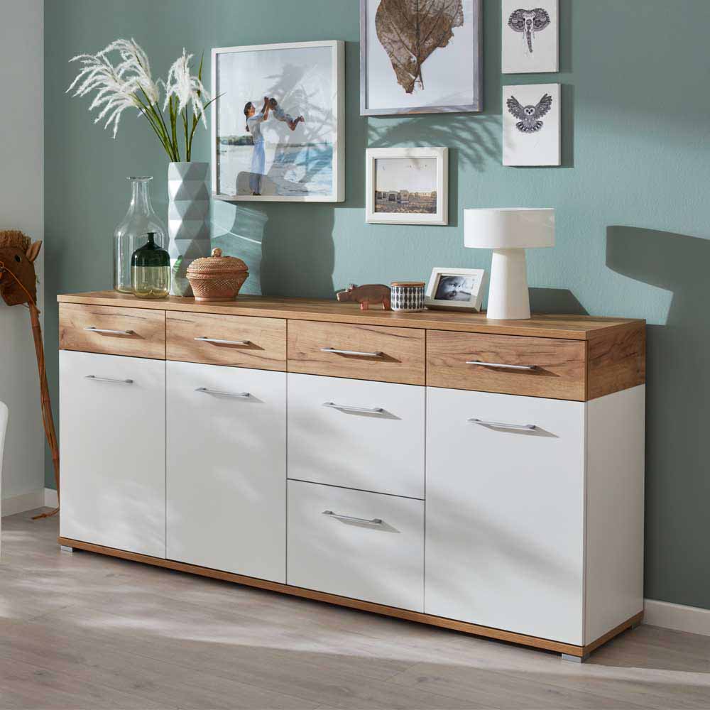 – Sideboard Weiß und Eichefarben – Wohnzimmerschrank Spanplatte – Kommode Klassisch schlicht – Sidebord Breite: 192 – Küchenkommode Höhe: 87 – Wohnzimmer schrank Tiefe: 40 – Wohnzimmer kommode Mit sechs Schubladen und mit Soft Close – Große kommode Schrank-Tür: mit Drehtüren – Esszimmer kommode 3-türig (mit Türdämpfung), Innenaufteilung: mit Einlegeböden – Wohnzimmerkommode Ohne Beleuchtung – Esszimmerkommode Zerlegt, zum leichten Selbstaufbau (Montageanleitung liegt bei) – Schubladensideboard Deutsche Produktion – Küchensideboard Melaminbeschichtet – Esszimmersideboard Metallgriffen – Eichenkommode Mit stoßfesten ABS Kanten – Rechteckige Form – Holzwerkstoff TürInformationen zur Lieferung:Die Zustellung dieses Produktes erfolgt per Spedition. Sie werden vor der Auslieferung durch die ausliefernde Spedition kontaktiert.Terminvereinbarung: Sie werden frühzeitig (ein paar Tage im Voraus) durch die ausliefernde Spedition kontaktiert und Ihnen der Auslieferzeitpunkt mitgeteilt. Die Kontaktaufnahme erfolgt per Telefon. Bei telefonischer Nichterreichbarkeit werden Sie per Postkarte über das Auslieferdatum informiert.Die Lieferung erfolgt aus Kostengründen Frei Bordsteinkante (bis zur ersten verschlossenen Tür). Für den weiteren Transport der Ware sind Sie eigenverantwortlich.Die Auslieferung erfolgt von Montags bis Freitags. Eine Zustellung an Sonn- und Feiertagen ist nicht möglich.