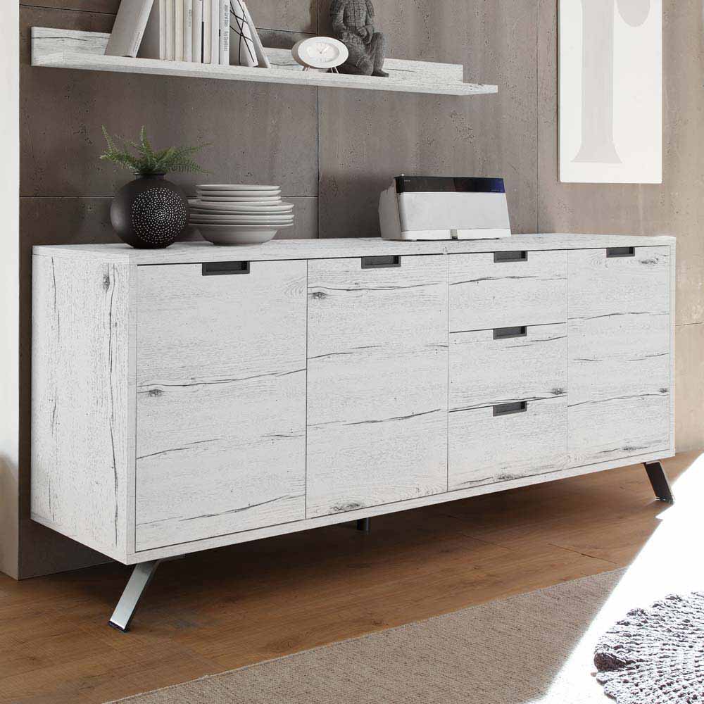 – Sideboard Weißeiche – Wohnzimmerschrank Spanplatte – Kommode Retrostil – Sidebord Breite: 206 – Wohnzimmer schrank Höhe: 85 – Wohnzimmer kommode Tiefe: 50 – Große kommode Mit drei Schubladen und mit Metallauszug – Esszimmer kommode Schrank-Tür: mit Drehtüren – Wohnzimmerkommode 3-türig, Innenaufteilung: mit Einlegeböden – Esszimmerkommode Ohne Beleuchtung – Esszimmersideboard Zerlegt, zum leichten Selbstaufbau (Montageanleitung liegt bei) – Schubladensideboard 4-Fuß Gestell aus Metall und 4-Fuß Gestell aus Kunststoff – Küchensideboard Kunststoffgriffen – Rechteckige Form – Holzwerkstoff Tür