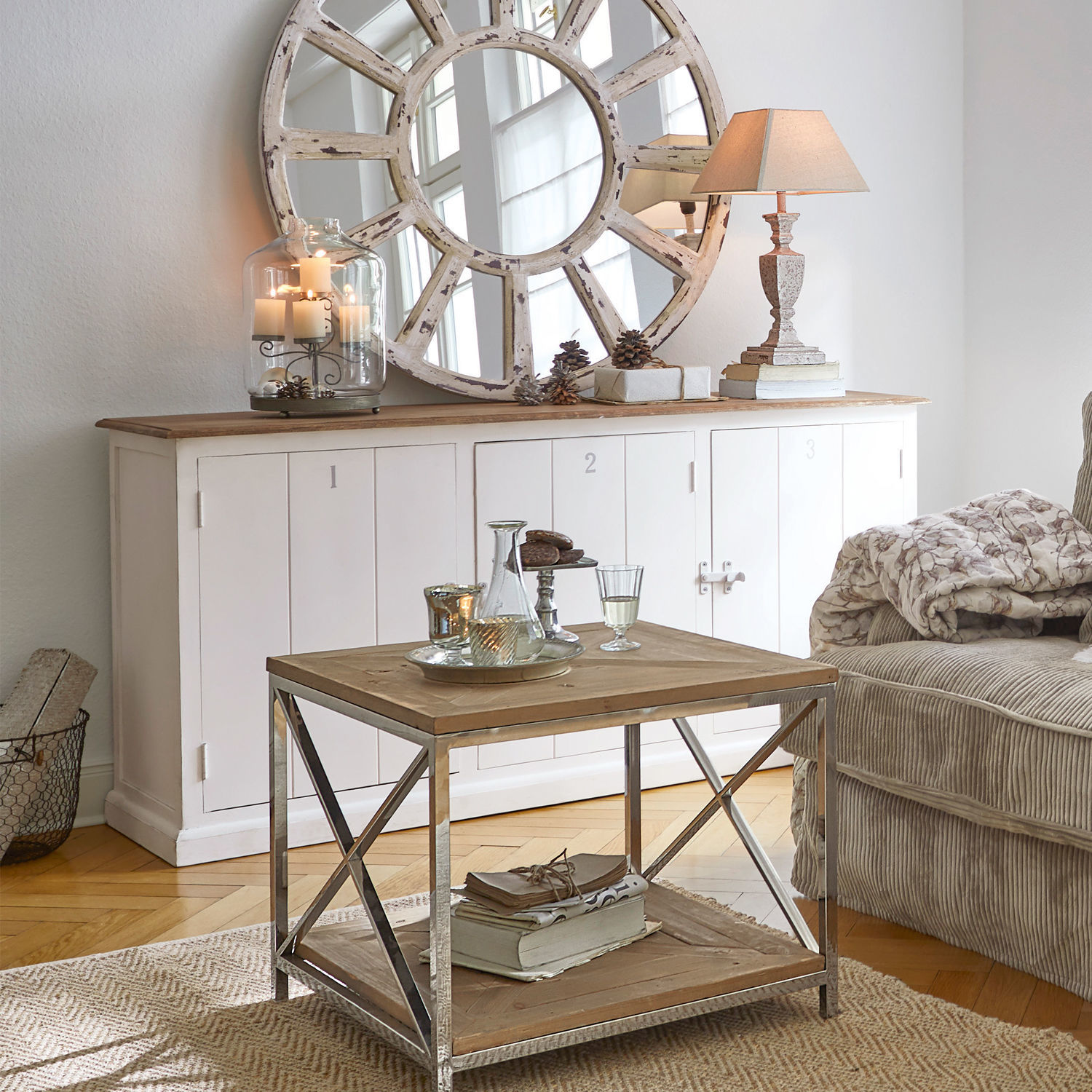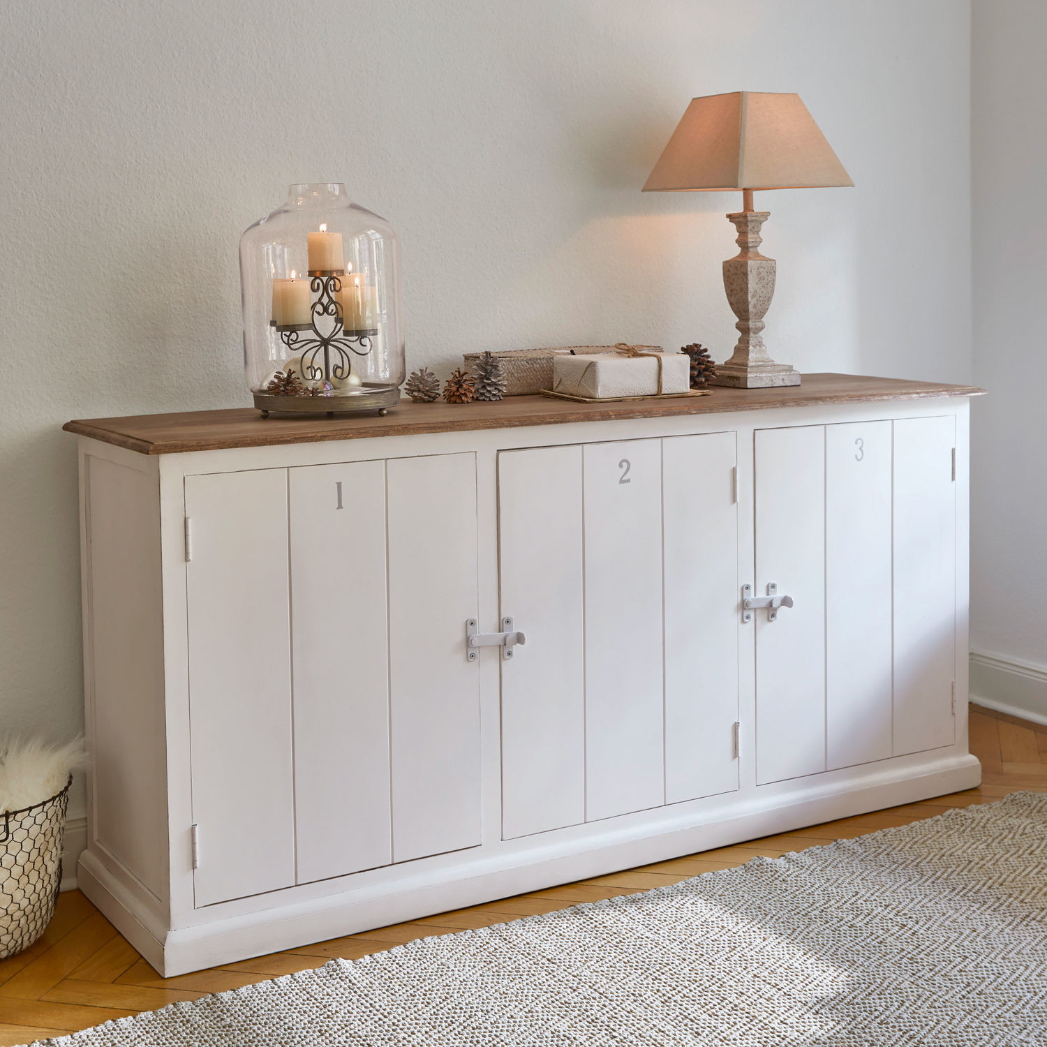 Wenn dieses Sideboard in einem Raum Einzug hält, weckt es sofort Assoziationen von geöffneten Fenstern und wehenden Gardinen, von sommerlich maritimer Seeluft und entspanntem Urlaubs-Feeling. Denn das Möbelstück erinnert an die Interieurs der noblen Landhäuser in den Hamptons vor New York, wo klare Linien, frische Farben und edle Materialien das Bild bestimmen. Auch bei diesem Sideboard hat der Möbeldesigner mit massivem Mangoholz zu einem hochwertigen Naturmaterial gegriffen. Für den Korpus wählte er ein helles Finish, mit der naturbelassenen Platte setzt er einen eleganten Kontrast dazu und betont die ausdrucksstarke Maserung des Mangoholzes lediglich mit einer dezenten Lasur. Seine besondere Persönlichkeit erhält das in aufwändiger Handarbeit gefertigte Möbelstück schließlich durch feine Stilelemente wie die hübschen Ziffern, die stylischen Drehverschlüsse auf den Türen und natürlich durch die stilechte Lattenoptik – eine Komposition, die an die Optik traditioneller Strand-Umkleiden erinnert. Aber das Sideboard begeistert auch mit inneren Werten. Schließlich verbirgt sich hinter jeder Tür des geräumigen Landhaus-Möbels ein herausnehmbarer Einlegeboden und damit ausreichend Ablagefläche für Ihre Tischwäsche, das Outdoor-Geschirr, Tabletts oder ausgewählte Accessoires für romantische Sommerabende auf Ihrer Terrasse.