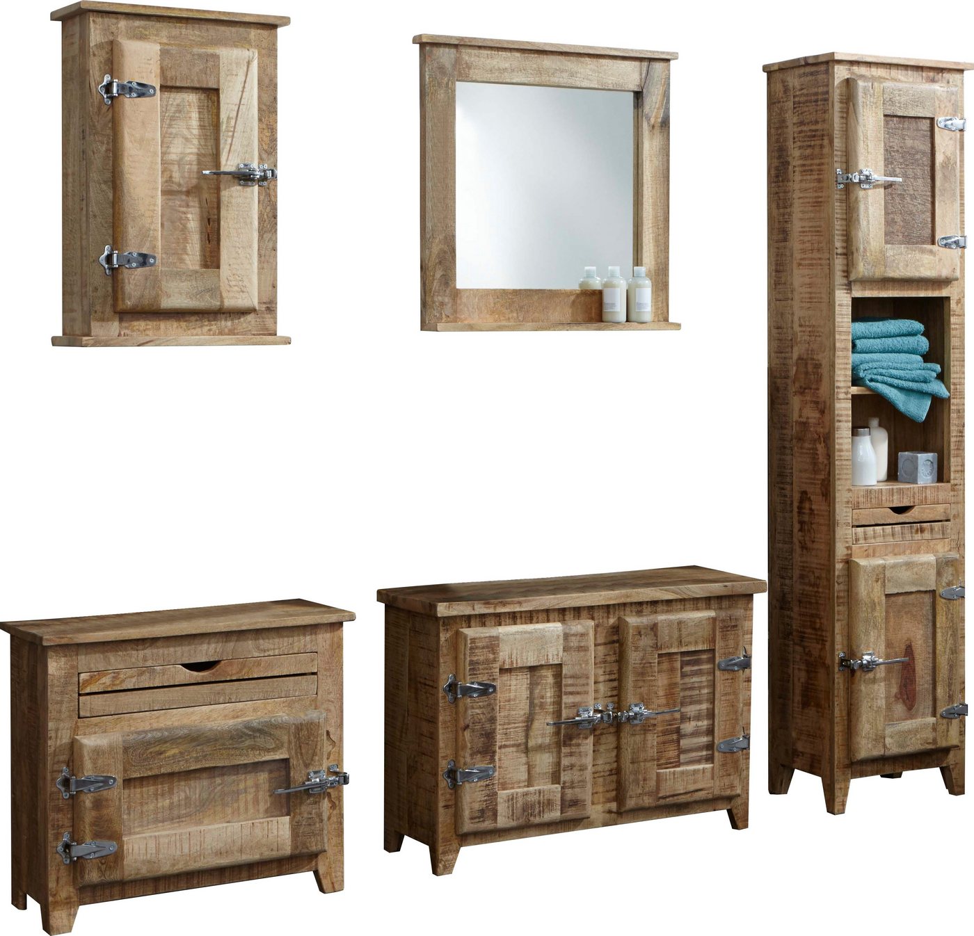 Mit dem hochwertigen Badmöbel-Set »Frigo« von SIT im modernen Vintage-Stil kannst du deinem Badezimmer eine wohnliche Atmosphäre verleihen. Die Badmöbel sind aus einem Massivholz gefertigt und aufwendig verarbeitet. Highlights wie die rustikalen Oberflächen, die aufgesetzten Scharniere und die extravaganten Kühlschrankgriffe verleihen dem Badezimmermöbel-Set seinen Charme. Das fünfteilige Set umfasst neben einem Waschbeckenunterschrank, einem Unter- und einem Hängeschrank im Weiteren einen Hochschrank und einen Spiegel. Das Möbel-Set bietet genügend Platz für die Badezimmerutensilien der ganzen Familie. Das verwendete Mango-Massivholz stammt aus einer FSC®-zertifizierten Produktion. Der Türanschlag ist wechselbar, sodass du die Möbel auf deine Bedürfnisse anpassen kannst. Das hochwertige Badmöbel-Set »Frigo« von SIT im modernen Vintage-Stil bietet dir genügend Stauraum.