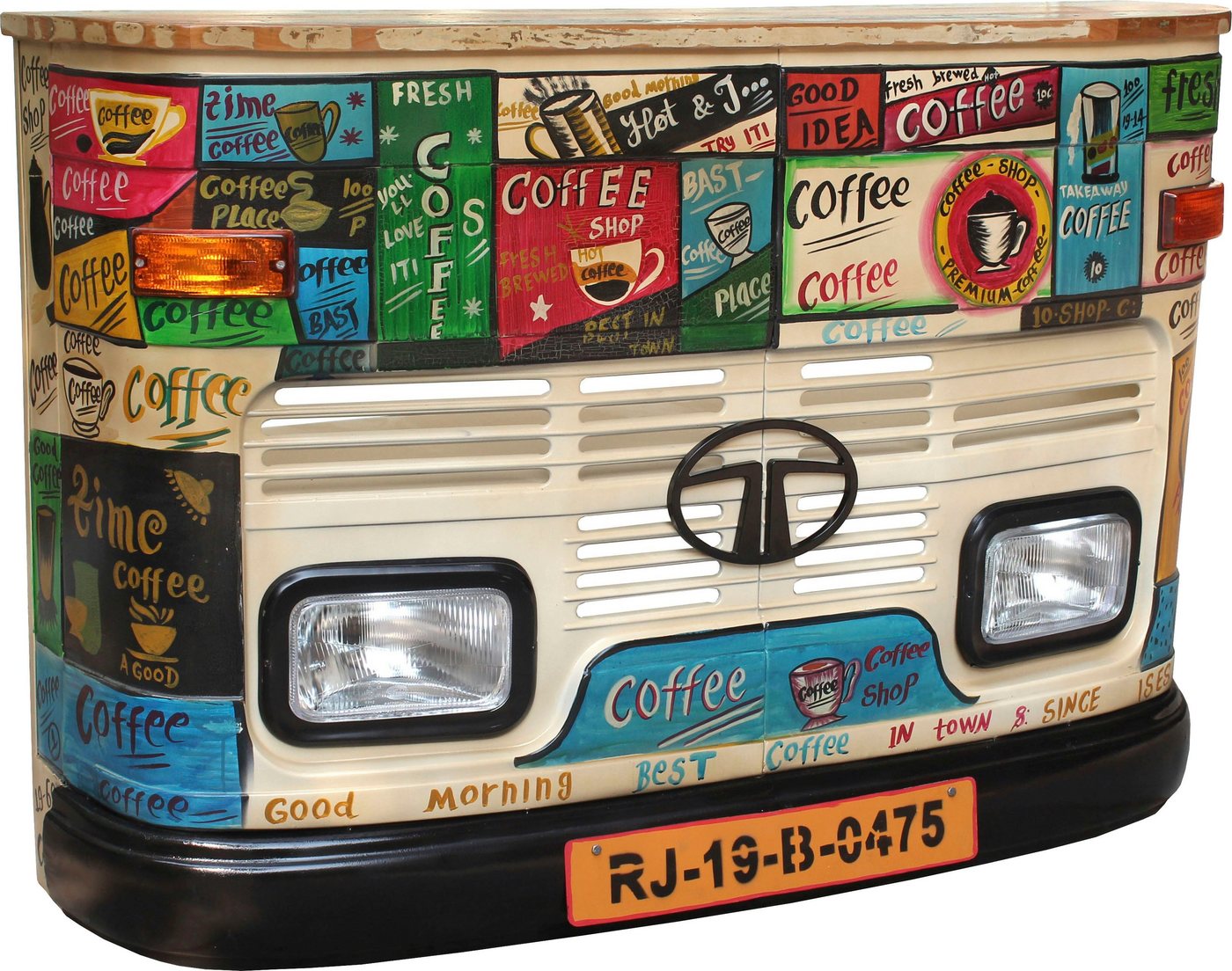 Außergewöhnlich, stylisch und dekorativ ist dieser Bartisch von SIT. Seine attraktive und farbenfrohe Front, bestehend aus alten Lkw-Teilen sowie Holzelementen, die aus recyceltem Altholz gefertigt sind, sticht sofort ins Auge. So kannst du dieses trendige Möbelstück gut nutzen, um einzelne Räume gezielt aufzuwerten. Auch von Vorteil ist, dass der Tisch gut mit anderen Farbtönen harmoniert sowie Kombinationen mit weiteren Möbelstücken zulässt. Auf der Rückseite findest du einen Ablageboden sowie praktische Flaschenhalterungen, um all deine Barutensilien und Gläser unterzubringen und griffbereit aufzubewahren. Funktional und optisch ansprechend: der dekorative Bartisch von SIT.
