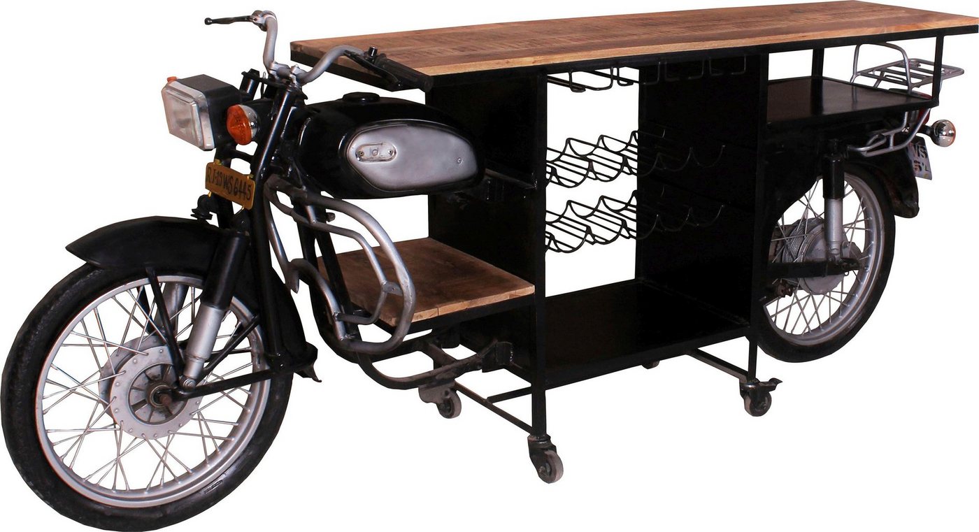 Der Bartisch »This&amp,That« der Marke SIT im Motorrad-Look wird zum originellen Blickfang im Zuhause. Er ist in liebevoller Kleinarbeit aus alten Motorrädern der indischen Marke Rajdoot gefertigt, wobei ausschließlich Unikate entstehen. Die aufgesetzte Tischplatte aus Massivholz mit strukturierter Maserung rundet den Look stilvoll ab. Auf ihr steht ausreichend Platz zur Verfügung, um Gläser und Flaschen sowie Schalen mit Knabbereien für Gäste abzustellen. Zusätzlich ist das Barmöbel mit einem praktischen Flaschenregal aus Metall sowie mit einer Aufhängevorrichtung für Weingläser ausgestattet. Da es auf Rollen steht, lässt es sich bei Bedarf vom Wohn- in das Esszimmer schieben. Ein Eyecatcher für das Zuhause: der Bartisch »This&amp,That« von SIT im Motorrad-Look.