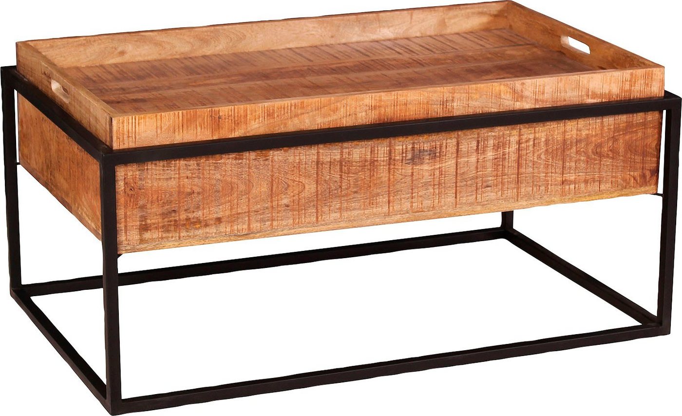 Begeistert durch praktische Extras: der Couchtisch von SIT mit abnehmbarem Tablett. Er ergänzt deine Wohnzimmereinrichtung im angesagten Industrial Stil und überzeugt mit einer schönen Holzoptik. Durch seine sicht- und fühlbare Struktur versprüht der Tisch ein rustikales Flair. Einen attraktiven Kontrast setzt das schöne Kufengestell aus Metall. Ausgestattet ist der Sofatisch mit einem abnehmbaren Tablett, auf dem sich Speisen und Getränke servieren lassen. Darunter bietet er Stauraummöglichkeiten für diverse Accessoires. Hergestellt ist der Wohnzimmertisch aus massivem Mangoholz. Punktet mit Multifunktionalität: der Couchtisch von SIT mit abnehmbarem Tablett.