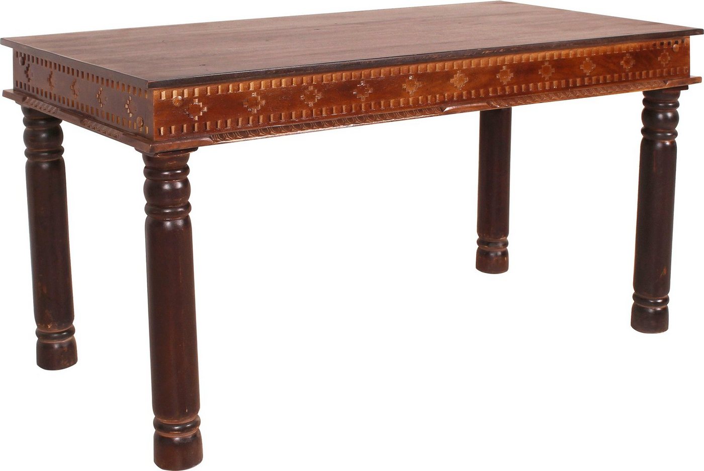 Der rustikal gestaltete Esstisch aus dem Hause SIT überzeugt mit einer ausgefallenen Optik, die an antike Vorbilder erinnert. Er ist mit aufwendigen Schnitzereien versehen, die eine attraktive Borte um die Tischplatte bilden. Gedrechselte Füße komplettieren den einzigartigen Stil. Dieser hochwertig verarbeitete Tisch ist robust und langlebig ausgeführt und kann im Wohnzimmer oder in der Küche nützliche Dienste leisten. Beim Kauf wirst du ein ruhiges Gewissen haben, denn dieses nachhaltige Möbelstück wird aus Altholz hergestellt. Im Weiteren sind die verwendeten Holzwerkstoffe FSC®-zertifiziert. Mit dem rustikal gestalteten Esstisch aus dem Hause SIT richtest du deine Wohnung stilvoll und individuell ein.