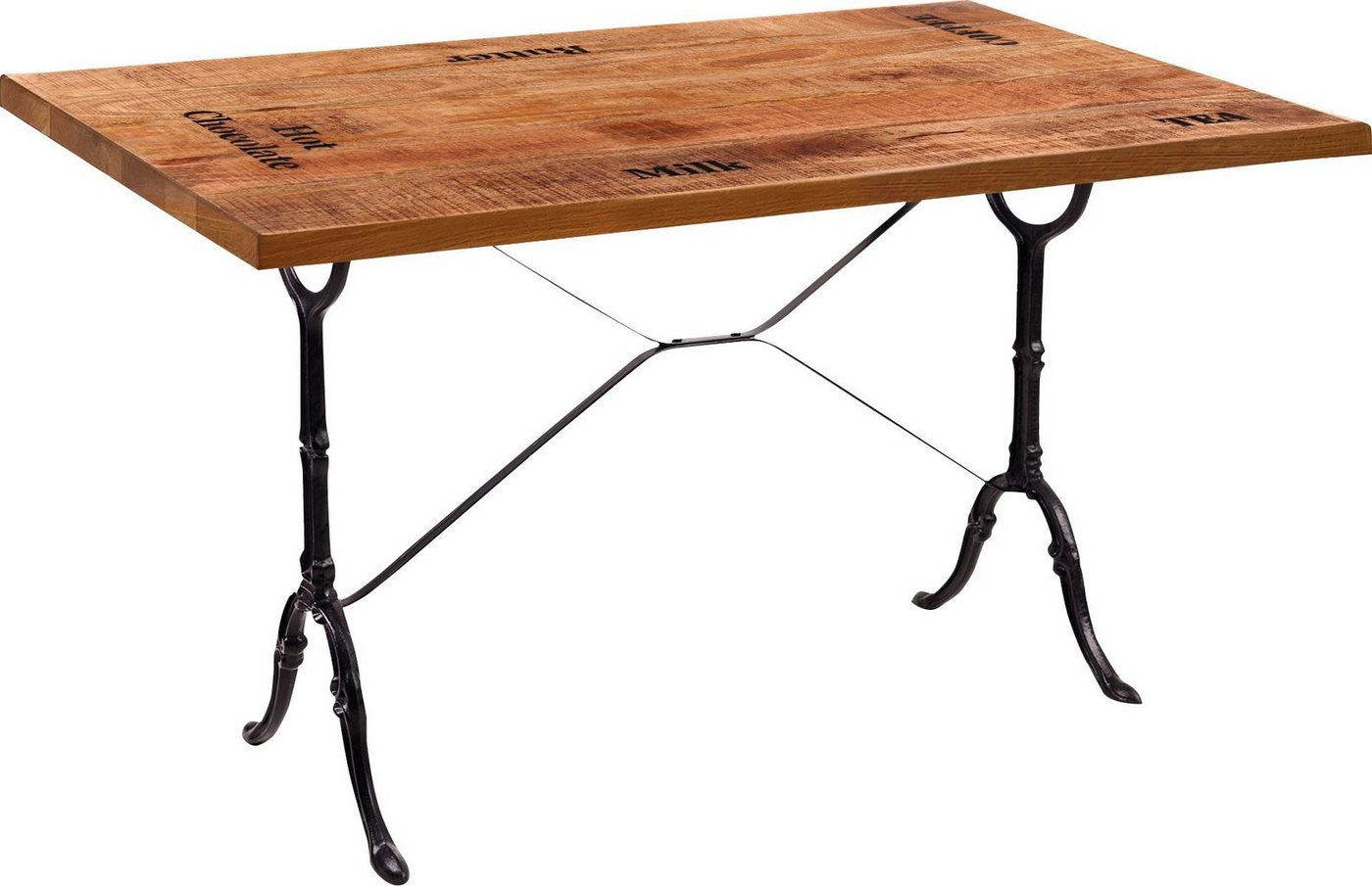 Dieser Esstisch von SIT bereichert deine eigenen vier Wände im originellen Bistro-Stil. Ausgestattet ist er mit einer rechteckigen Tischplatte in Holzoptik, die über Aufdrücke im Industrial-Look verfügt. Als Highlight besitzt der Esszimmertisch ein dekoratives Gestell aus Gusseisen. Nach Belieben lässt er sich zu Einrichtungen im Vintage-Stil oder auch modernen Wohnkonzepten kombinieren. Auf der Tischplatte bietet das Esszimmermöbel genügend Platz für mehrere Gedecke sowie Blumenvasen. Hergestellt wird diese aus massivem Mangoholz. Wertet dein Esszimmer gekonnt auf: der Esstisch von SIT im originellen Bistro-Stil.