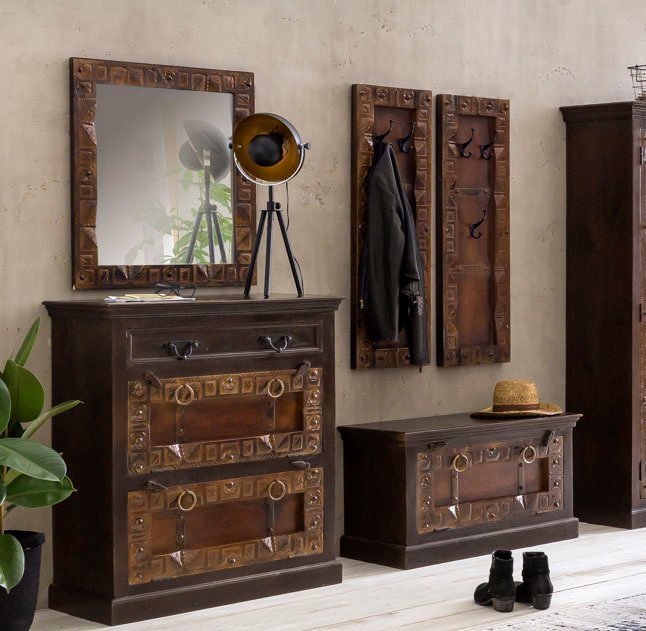 Produktdetails Produktdetails , In folgenden Farben erhältlich: Korpus/Front: dunkelbraun, Front mit Struktur, Farbe Griffe: messing, Details zur Ausstattung: Laufleisten der Schubkästen aus Holz, Metallgriffe, FSC®-zertifiziert, Set bestehend aus: Paneel 2, Schuhschrank 2, Spiegel 1, Paneel: 4 Haken, Maße (B/T/H): 35/8/110 cm cm, Schuhschrank: 2 oder 1 Klappen, 1 oder 0 Schubkästen, 2 oder 1 feste Böden, Platz für ca. 12 oder 6 Paar Schuhe, Rückwand gänzlich geschlossen, Maße (B/T/H): 85/40/90 oder 85/40/45 cm cm, Spiegel: xx Ablagen, Mit Rahmen, Maße (B/T/H): 68/8/79 cm cm, , | Farbe Farbe , dunkelbraun, | Maßangaben Hinweis Maßangaben , Alle Angaben sind ca.-Maße., | Wissenswertes Wissenswertes , Material: Korpus: Massivholz, Front: Massivholz, aus recyceltem Altholz, Informationen zu Lieferumfang und Montage: Montiert, FSC®-zertifiziert: Das Label des FSC® weist nach, dass Sie mit dem Kauf dieser Produkte vorbildlich Waldwirtschaft – nach den strengen ökologischen, sozialen und wirtschaftlichen Standards des Forest Stewardship Council® – fördern und die Waldressourcen schonen., Pflegehinweise: Pflegehinweise für naturbelassene/gelackte Möbel aus Naturholz: Mit einem mäßig feuchten Tuch säubern. Keine Lösungsmittelhaltige Reinigungsmittel oder Politur verwenden. , , | Lieferung & Montage Lieferzustand , zerlegt, |