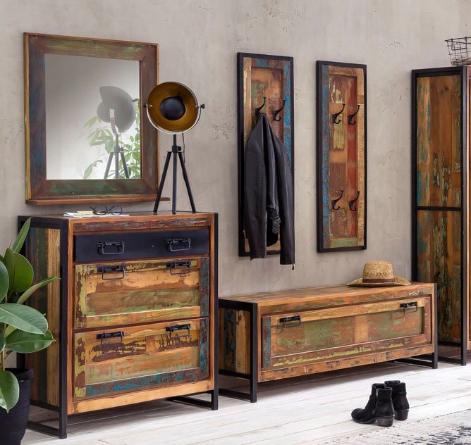Produktdetails Produktdetails , In folgenden Farben erhältlich: Korpus/Front: bunt, Farbe Griffe: schwarz, Farbe Füße: schwarz, Details zur Ausstattung: Laufleisten der Schubkästen aus Holz, Metallgriffe, FSC®-zertifiziert, Set bestehend aus: Paneel 2, Schuhschrank 2, Spiegel 1, Paneel: 4 Haken, Maße (B/T/H): 35/8/110 cm cm, Schuhschrank: 2 / 1 Klappen, 1 / 0 Schubkästen, 2 / 1 feste Böden, Platz für ca. 12 / 8 Paar Schuhe, Rückwand gänzlich geschlossen, Maße (B/T/H): 85/40/96 cm / 130/40/50 cm cm, Spiegel: xx Ablagen, Mit Rahmen, Maße (B/T/H): 68/8/79 cm cm, , | Farbe Farbe , bunt, | Maßangaben Hinweis Maßangaben , Alle Angaben sind ca.-Maße., | Wissenswertes Wissenswertes , Material: Korpus: Massivholz, Front: Massivholz, Füße aus Altmetall, aus recyceltem Altholz, Informationen zu Lieferumfang und Montage: Montiert, FSC®-zertifiziert: Das Label des FSC® weist nach, dass Sie mit dem Kauf dieser Produkte vorbildlich Waldwirtschaft – nach den strengen ökologischen, sozialen und wirtschaftlichen Standards des Forest Stewardship Council® – fördern und die Waldressourcen schonen., Pflegehinweise: Pflegehinweise für naturbelassene/gelackte Möbel aus Naturholz: Mit einem mäßig feuchten Tuch säubern. Keine Lösungsmittelhaltige Reinigungsmittel oder Politur verwenden. , , | Lieferung & Montage Lieferzustand , zerlegt, |
