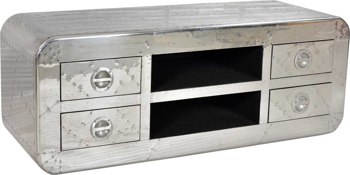 Das Lowboard »AIRMAN« von SIT begeistert mit moderner Flugzeugoptik und erweist sich dadurch als origineller Hingucker im Wohnraum. Es ist von Hand mit Alu beschlagen, wodurch es seine schön glänzende Optik erhält. In Kombination mit den einzeln verschraubten Modulen entsteht ein trendiges Factory-Design, das die eigenen vier Wände optisch aufwertet. In den offenen Fächern und Schubladen befindet sich allerlei Platz für die Unterbringung verschiedenster Utensilien. Es kann genauso gut als Stauraum für Wohnaccessoires sowie auch als praktischer Fernsehtisch genutzt werden. Zudem überzeugt die Anrichte mit hochwertiger Verarbeitung. Ob im Wohn-, Schlafzimmer oder in der Diele, das SIT Lowboard »AIRMAN« setzt mit seiner Flugzeugoptik einen modernen Akzent im Zuhause.