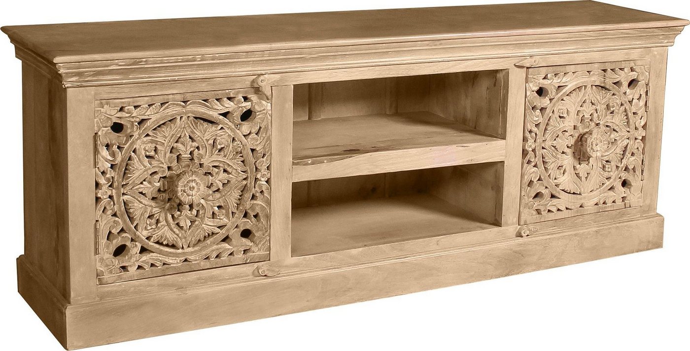 Im extravaganten Design zeigt sich das Lowboard »Lakadee« der Marke SIT. Optisch zeichnet sich das Wohnzimmermöbel durch eine attraktive Optik aus, die maßgeblich durch die aufwendigen Schnitzereien auf den Türen geprägt wird. Auch funktional kann das Wohnzimmermöbel überzeugen. Es verfügt über offene Fächer und zusätzlichen Stauraum hinter den beiden Türen. Dazu ist der Oberboden großzügig gestaltet, sodass hier der Fernseher einen Platz findet. Hergestellt ist das TV-Möbel aus recyceltem Altholz – bei Bedarf kann es einfach gereinigt werden. Eine Bereicherung der Wohnzimmereinrichtung stellt das extravagante Lowboard »Lakadee« der Marke SIT dar.