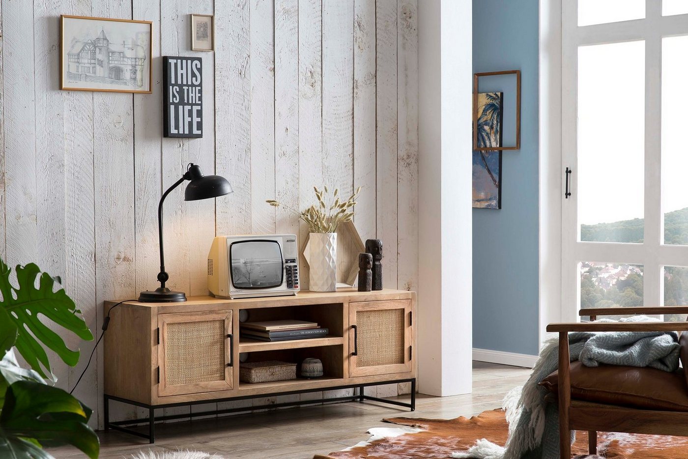 Besticht im attraktiven Materialmix: das geräumige Lowboard von SIT im Industrial-Stil. Ein modernes Design-Gestell aus schwarzem Metall ist mit Einsätzen aus Rattangeflecht in den Türen kombiniert. Hergestellt wird das hochwertig verarbeitete Wohnzimmermöbel aus massivem Mangoholz. Du kannst es mühelos in unterschiedliche Wohnkonzepte und Einrichtungsstile integrieren, puristisch bis elegant. Hinter den beiden Türen steht dir nützlicher Stauraum für Bücher, Spiele und weitere Dinge zur Verfügung. Dank mehrerer Kabeldurchführungen lassen sich deine HiFi-Geräte problemlos obenauf platzieren. Hochwertig verarbeitet und im Handumdrehen zu reinigen: das geräumige Lowboard von SIT im angesagten Industrial-Stil.