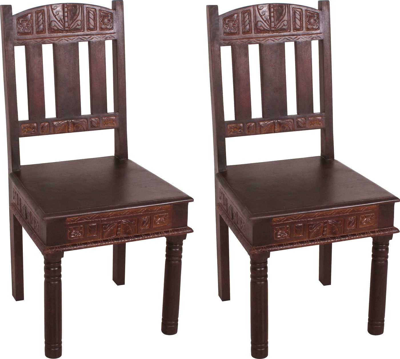 Reich verziert mit aufwendigen Schnitzereien ist dieser Stuhl aus dem Hause SIT. Er ist aus recyceltem, massivem Altholz hergestellt und kommt im 2er Set. Das Sitzmöbel zeichnet sich durch eine besonders stabile Ausführung mit extrahoher Lehne aus. Die üppigen Schnitzereien in Lehne und Sitzfläche runden das attraktive Erscheinungsbild ab. Kombiniere diese außergewöhnliche Sitzgelegenheit mit klassischen, modernen oder stylischen Möbeln. Bei Bedarf kannst du die Sitzgelegenheit einfach feucht abwischen. Im orientalischen Stil gefertigt: der Stuhl im 2er Set aus dem Hause SIT in stabiler Ausführung.