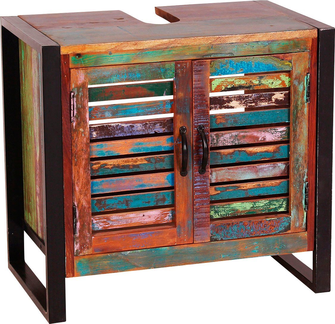 Jedes Stück ein Unikat: Der Unterschrank von SIT aus buntem Massivholz wird zum Blickfang in deinem Badezimmer. Es handelt sich bei diesem Stauraumschrank um ein nachhaltiges Design dank einer Fertigung aus recyceltem Altholz. Der schwarze Metallrahmen im Industrial-Stil rundet den stylischen Look dieses Schranks harmonisch ab. Kombinieren lässt er sich mit unterschiedlichen Einrichtungen, puristisch bis farbenfroh. Dank eines Siphonausschnitts kannst du den Unterschrank problemlos unter deinem Waschbecken platzieren. Hinter seinen beiden Türen bietet er dir reichlich Stauraum für Badaccessoires und Putzutensilien. Gefertigt aus bunt lackiertem Altholz: der praktische Unterschrank von SIT mit Siphonausschnitt.