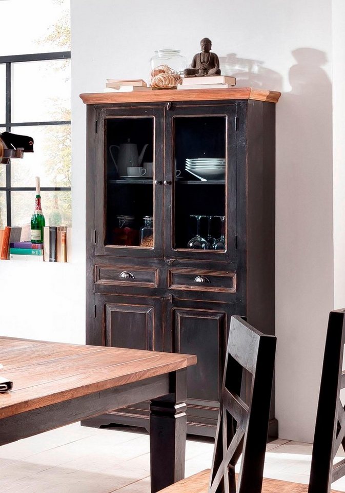 Für Menschen, mit dem besonderen Geschmack ist die Vitrine »Corsica« im mediterranen Landhausstil von SIT eine tolle Wahl. Gefertigt wird das Möbel aus FSC®-zertifiziertem Massivholz. Dabei wird Altholz verwendet, das durch die Veredelung eine antike Note erhält. Der charmante Eindruck wird durch die rustikalen Griffe zusätzlich unterstrichen. Der Vitrinenschrank bietet sich an für die Diele, den Flur oder den Wohnbereich. Hinter den mit Glaseinsatz ausgestatteten oberen Türen lassen sich ideal die persönlichen Schätze wie Deko-Accessoires, Familienbilder oder Sammlergeschirr in Szene setzen. In den mittigen Schubkästen und hinter den blickdichten Türen unten können die unterschiedlichsten Dinge staubfrei aufbewahrt werden. Eine Bereicherung der Einrichtung mit südländischem Flair: die im mediterranen Landhausstil gestaltete SIT Vitrine »Corsica«.