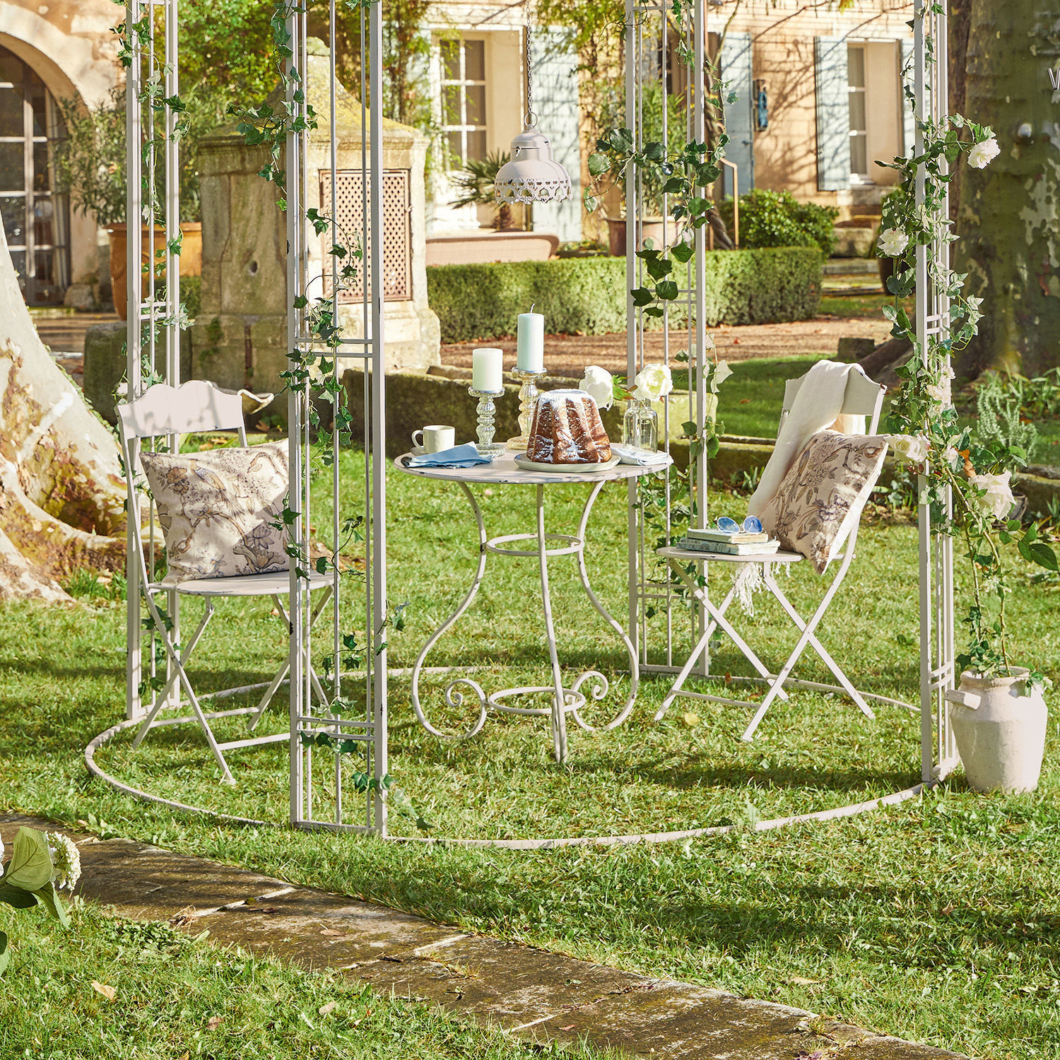Diese charmante Sitzgruppe entspricht klassischen Vorbildern des 19. Jahrhunderts. Man könnte tatsächlich meinen, es handle sich um antike Fundstücke aus Frankreich. In Sachen Material und Verarbeitung gleichen Tisch und Stühle den Originalen quasi bis aufs Haar. Sie werden aus reinem Eisen gefertigt und mit einem aufwendigen Antik-Finish veredelt.
