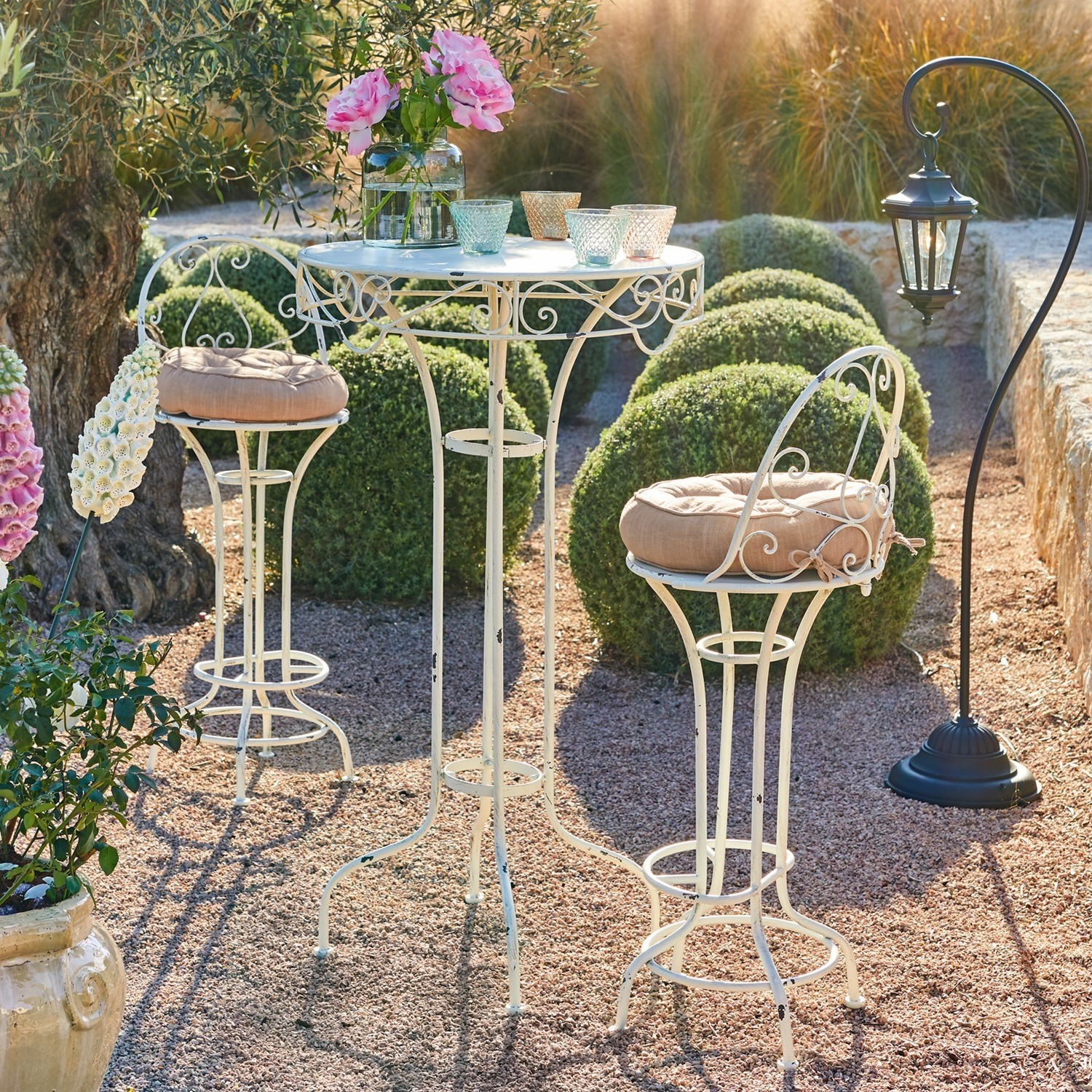 Bonjour in Ihrem Garten oder auf der Terrasse! Dieses wunderschöne und sehr filigrane Trio ist einfach die perfekte Wahl, um den ersten Kaffee des Morgens oder einen kühlen Eistee zu genießen. Der leichte Tisch und die beiden Stühle mit schmalem Fuß sind kunstvoll mit verspielten Schnörkeleien verziert – sehr romantisch und mit einer Prise Vintage-Flair. Die Sitzgruppe besteht aus weiß lasiertem Eisen mit einem schönen Antik-Finish. Das Design ist von französischen Bistro-Möbeln inspiriert und entführt uns gedanklich nach Frankreich. Ob im Garten, auf dem Balkon oder in Ihren Innenräumen – diese stabile und hochwertige Sitzgruppe wird Ihnen lange Freude machen und viele entspannte Stunden bescheren. Die passenden Sitzkissen gleich mitbestellen: 15257.