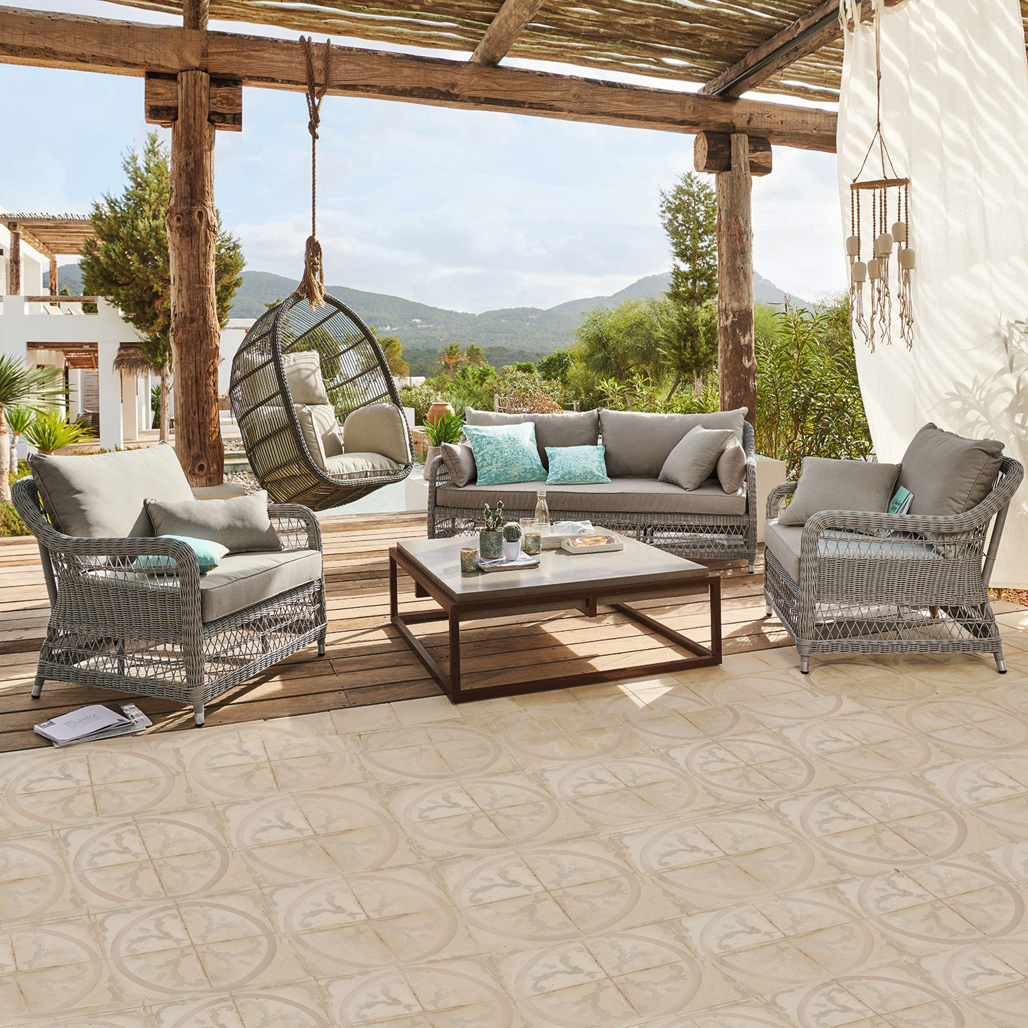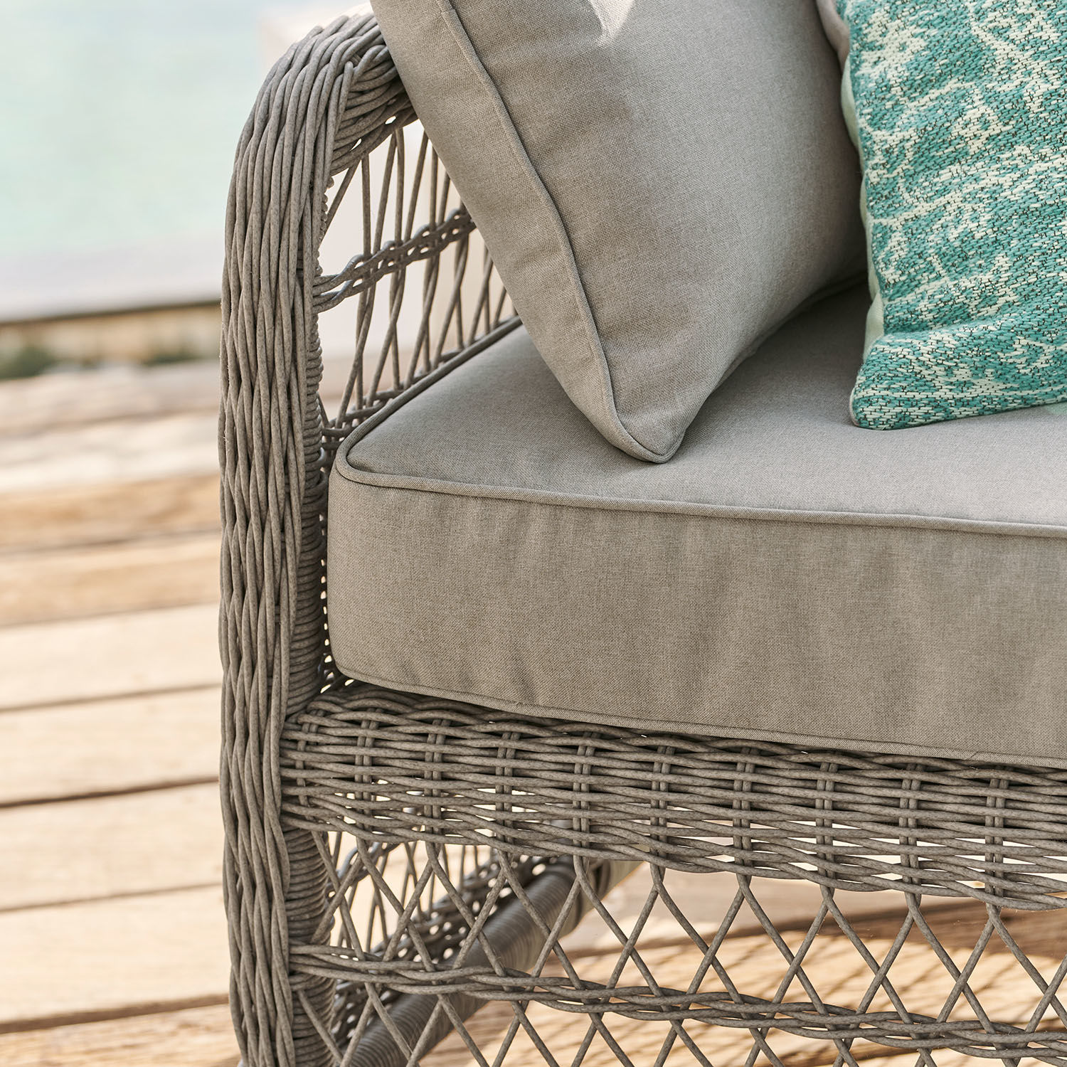 Den einen erinnert das elegante Ensemble an schöne Urlaubstage im sonnenverwöhnten Süden Frankreichs, andere müssen dabei an die Terrasse einer Villa oberhalb des Lago Maggiore denken und wieder andere fühlen sich an einen Landsitz in der Toskana versetzt, wenn sie in einem der Sitzmöbel Platz nehmen. Denn Möbel mit französischem Esprit sind weit über die Grenzen ihres Heimatlandes hinaus beliebt und begehrt. Dieser Sitzgruppe aber gelingt das Kunststück, das unverwechselbare Flair mit bester Wettertauglichkeit zu verbinden. Denn sieht der Korpus wie Naturrattan aus, hat sich der Korbflechter in weiser Voraussicht doch lieber für das viel unkompliziertere, wetterfeste und zugleich pflegeleichte Polyrattan entschieden. Da aber auch diese elastischen Kunstfasern wie Naturrattan im traditionellen Stil um ein wetterfestes Aluminiumgestell geflochten wurden, sehen Sie hier zugleich ein Stück klassischer Korbflechterkunst. Ein filigranes, lichtdurchlässiges Flechtwerk, das die ganze Sitzgruppe leicht und luftig wirken lässt, obwohl sie mindestens fünf komfortable Sitzplätze bereithält. Apropos Komfort. Dafür sind bei dieser Sitzgruppe neben den großzügigen Maßen der Sitzflächen vor allem die dick gepolsterten Kissen verantwortlich, die aber auch auf der Dimension Pflegeleichtigkeit einiges zu bieten haben: sie haben einen wasserresistenten Bezug aus Polyestergewebe, den Sie abnehmen und waschen können.
