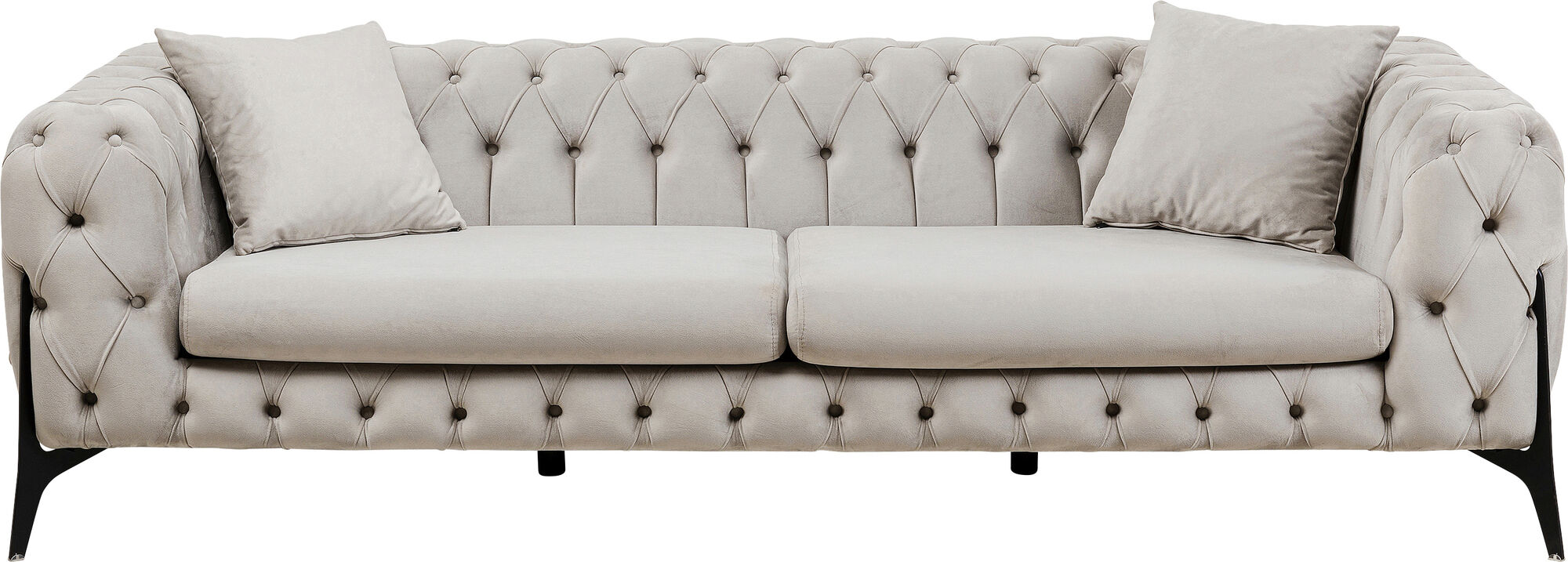 Ein Mix aus Retro und Modern? Das Sofa Bellissima trägt nicht ohne Grund seinen Namen – denn es ist mit seinem Stil einfach wunderschön. Der Korpus ist aus Buche Massivholz und bietet Stabilität. Die Rundumpolsterung verleiht der Couch einen besonders edlen und hochwertigen Look. Der Chesterfield-Stil mit der Knopfheftung macht das Samtsofa zu einem Klassiker. Die Besonderheit ist, dass sich die Knopfheftung auch über die Rückseite zieht, es wurde also nicht an Stil und Schönheit gespart, um das Sofa auch frei im Raum aufstellen zu können. Der 3-Sitzer mit der Breite von 240 cm lädt geradezu dazu ein, einen entspannten Abend mit Freunden oder Familie auf der Couch zu verbringen. Material: (Korpus: Buche Massivholz naturbelassen (Weißbuche), Sperrholz naturbelassen, Bezug: 100 % Polyester (Samtoptik), Fuß/Füße: Stahl pulverbeschichtet)
