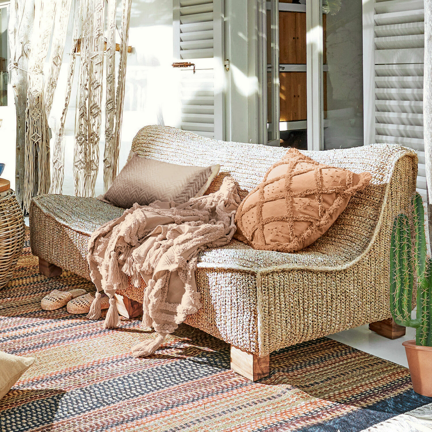 Lässig, individuell und mit einem ausgeprägten Faible für handgearbeitete Lieblingsstücke – kein Wunder, dass der Boho-Look schon mehr als eine Generation fasziniert hat und ein Revival nach dem anderen erlebt. Seinen besonderen Reiz entfaltet dieser unkonventionelle Wohnstil natürlich im Outdoor-Bereich, wo sich das Leben sowieso eine Portion ungezwungener abspielt als indoor. Und dieses Sofa wird sofort eine zentrale Rolle in Ihrem sommerlichen Outdoor-Living einnehmen, denn es hat alles, was den typischen Boho-Chic ausmacht. Das markanteste Merkmal ist natürlich das stylische Flechtmuster des Bezugs, das in kunstvoller Handarbeit gefertigt wurde. Ebenso faszinierend wie der ungewöhnliche Look ist aber auch das Material, denn es wurden echte Palmenblätter dafür verwendet. Also ein nachwachsendes und somit nachhaltiges Naturmaterial, dem man im Möbelbereich bisher selten begegnet und das dem Sofa ein ganz besonderes Flair gibt. Ein Klassiker im Gartenmöbelbereich ist dagegen das edle Teakholz, das bei diesem Sofa den stabilen Rahmen und die massiven Blockfüße bildet. Tipp: Zu diesem Sofa gibt’s einen Sessel im gleichen Look, so dass Sie beide zu einem stylischen Ensemble kombinieren können.