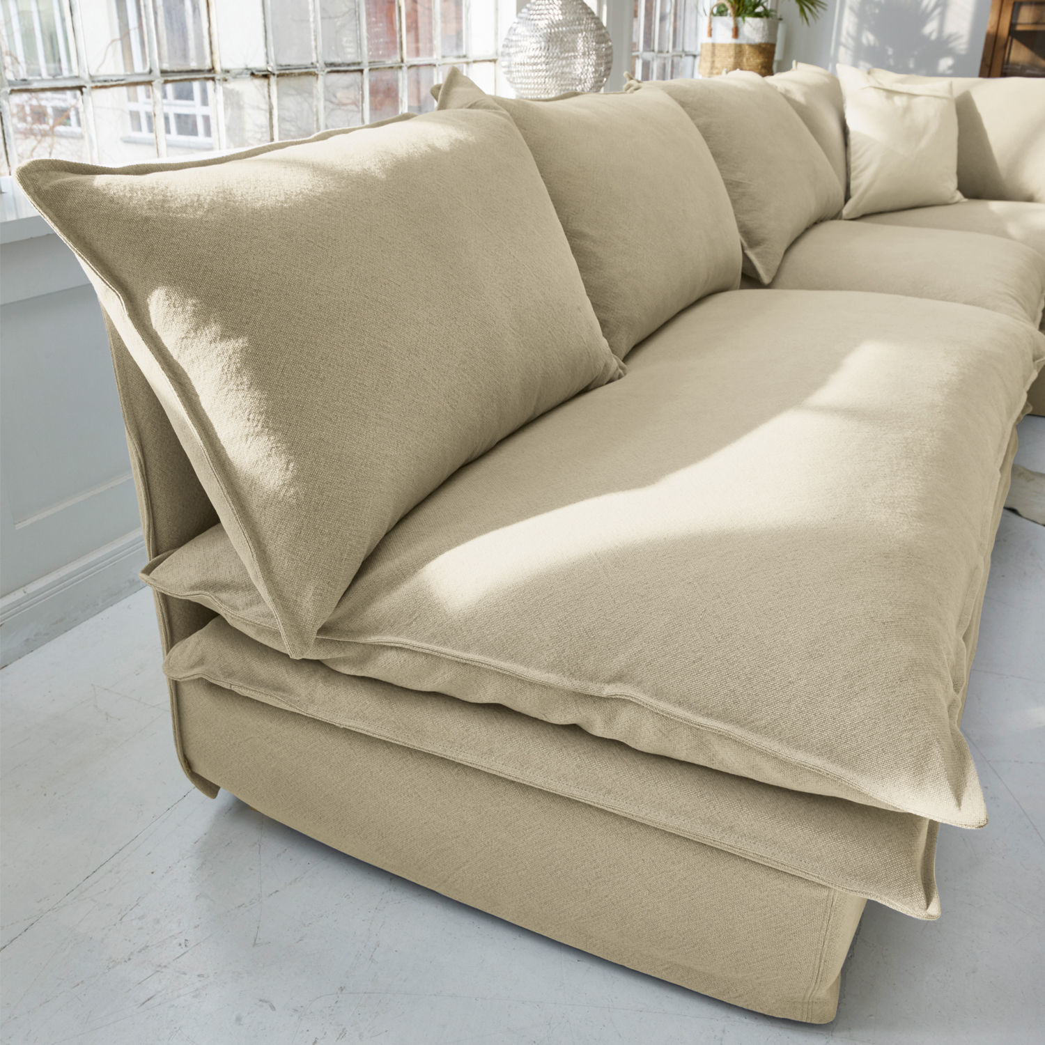 Diese traumhaft schöne Sofalandschaft wird ganz bestimmt schnell zum beliebten Mittelpunkt des Hauses. Kein Wunder, denn Platz genug ist garantiert für alle vorhanden. Zudem sitzt man auf den luxuriös gepolsterten Kissen äußerst komfortabel. Sehr bequeme Rücken- und Zierkissen machen den Komfort perfekt. Die Sitzgruppe besteht aus verschiedenen, perfekt aufeinander abgestimmten Sitzelementen. Ein Sofa, ein Sessel, eine Chaiselongue und ein Hocker ergeben eine tolles Gesamtkonzept. Doch nicht nur die hochwertige Verarbeitung überzeugt. Auch optisch ist hier einfach alles stimmig. Der ansprechende Bezug aus hochwertiger Baumwolle ist in einem sehr angenehmen Naturton gehalten. Dieser strahlt etwas Frisches und Natürliches aus und kann wunderbar mit verschiedenen Farben und Materialien im Zimmer kombiniert werden. Die Ränder des Stoffs ziert ein stilvoller Keder. Das Design ohne Armlehnen verleiht der Gruppe ein charmantes Lounge-Flair. Man bekommt sofort Lust, es sich auf dem Sofa gemütlich zu machen und mit einer guten Lektüre oder bei einem Film zu entspannen. Die locker aufliegenden Kissen können abgenommen werden. So kann das Möbelstück unkompliziert gereinigt werden. Das stabile und langlebige Gestell aus Pinienholz macht das schöne Stück perfekt. Wer mag, kann die einzelnen Stücke auch separat aufstellen oder variieren. Ob zum Long-Island-Stil, zu zeitgenössischem Interior oder zum Landhaus-Stil – dieses Prachtstück ist ein ganz besonderer Blickfang und die perfekte Ruhe-Oase für die Freizeit.