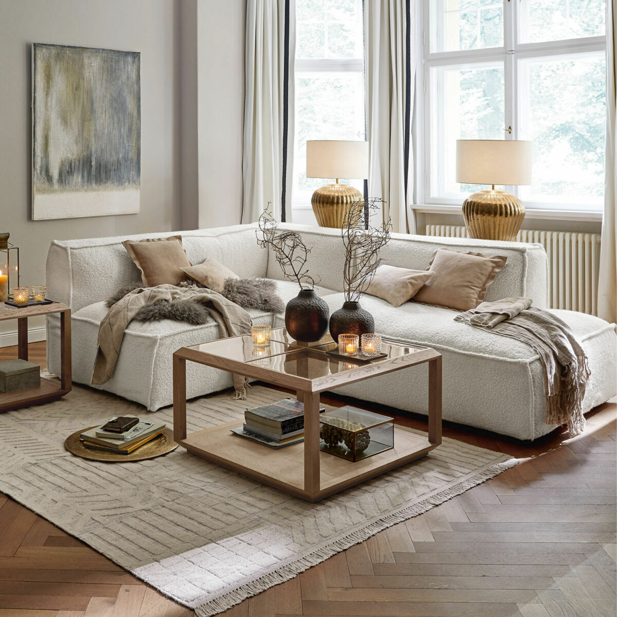 Was ist neben Möbeln aus edlen Hölzern und erlesenen Accessoires ein essentieller Bestandteil eines Wohnraums, der im modernen Landhaus-Stil möbliert wurde? Natürlich ein Sofa, das der ersehnte Ruhepol nach einem langen anstrengenden Arbeitstag ist. Ein Sofa, auf dem man nicht nur den Feierabend, sondern auch gemütliche Sonntagnachmittage verbringt, nur mit einem guten Buch und einer Tasse Tee. Ein Sofa, das ein beliebter Treffpunkt für die ganze Familie ist und auf dem auch Ihre Freunde gerne stundenlang verweilen. Kurz: Ein Sofa wie dieses hier. Das Interessante an diesem Modell: Es beweist auf charmante Art und Weise, dass Landhaus-Möbel nicht immer üppig verziert sein müssen. diesem Ecksofa genügt eine gerade Linienführung in Zusammenspiel mit edlen Naturmaterialien, um im Handumdrehen die Entspannungsinsel Nr. 1 in Ihrem Zuhause zu werden. Dafür leistet allerdings auch die integrierte Recamiere Ihren nicht unwesentlichen Beitrag, denn auf ihr können Sie wunderbar entspannend die Füße hochlegen. Komplettiert wird die exzellente Ausstattung dieses Sofas durch den stilechten Hussenbezug aus hautfreundlicher reiner Baumwolle und die Kissenfüllung mit echten Entenfedern. Für das komfortable Sitzerlebnis sorgen die klassischen Sprungfedern zusammen mit einer hochwertigen Schaumstoffpolsterung. Praktisches Extra: Der Hussenbezug, der durch die markanten Keder perfekt in Form gehalten wird, kann mit Hilfe der Klettverschlüsse abgenommen werden.