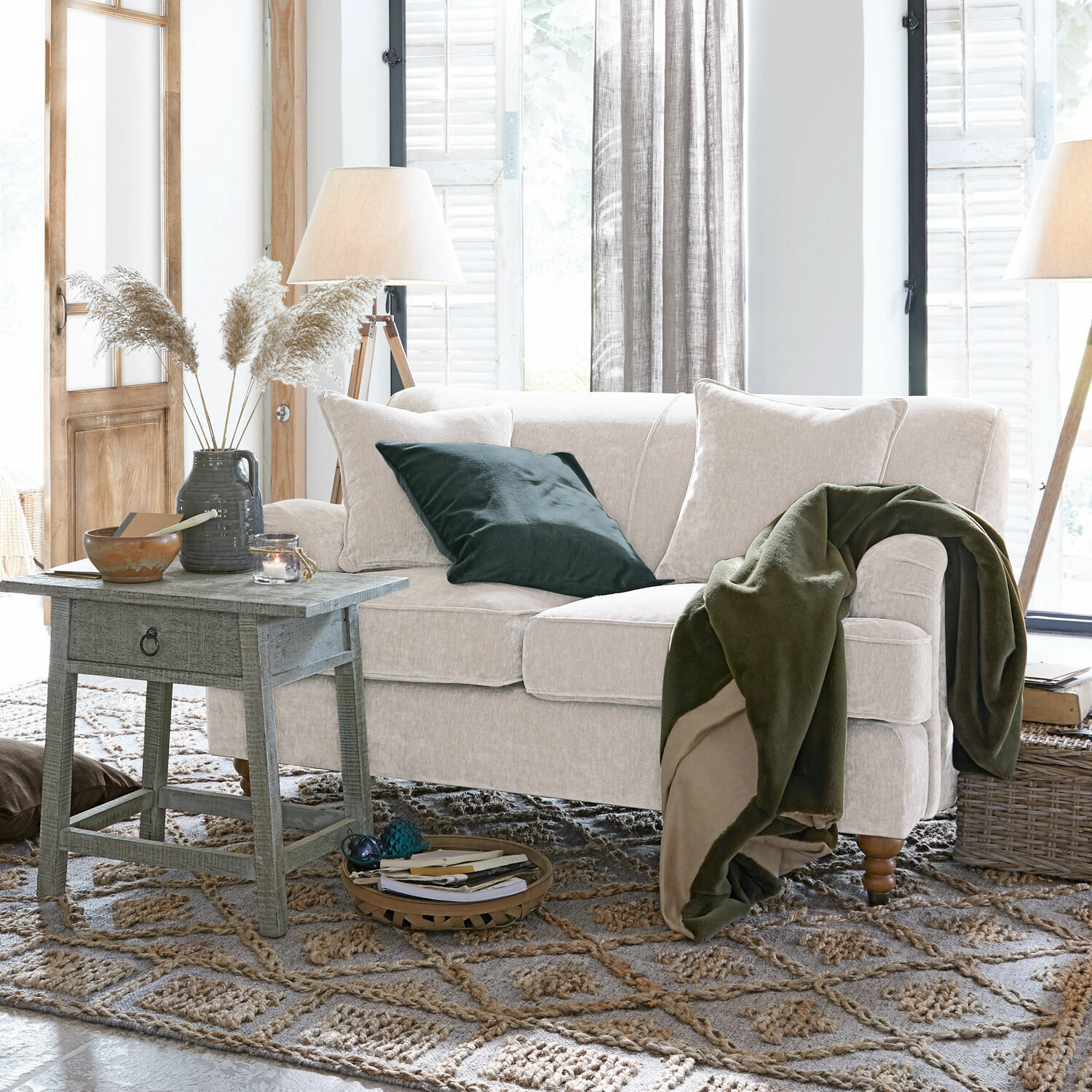 Couch, Kanapee, Diwan, Sofa – es gibt viele Namen für dieses Möbelstück, das sich seit Jahrhunderten großer Beliebtheit erfreut und sich im Laufe der Zeit in den verschiedensten Stilrichtungen präsentierte. Für alle, die ebenso viel Wert auf modernes Design wie auf erstklassigen Sitzkomfort legen, wurde dieses Sofa-Modell entworfen. Die dezente Farbgebung harmoniert vollendet mit der geradlinig schlichten Linienführung, die nur von weichen Kissen charmant aufgelockert wird, während die kunstvoll gedrechselten Füße eine liebevolle Reminiszenz an die historischen Vorbilder sind. Kurz: Ein Sofa, das seine Verwandtschaft zu den berühmten Design-Klassikern der italienischen Schule nicht verleugnen kann, für die Optik, Funktionalität und traditionelle, handwerkliche Fertigung immer Hand in Hand gehen. Deshalb wird Sie dieses Sofa nicht nur mit elegantem Design, sondern dank der weichen Schaumstoffpolsterung auch mit luxuriöser Bequemlichkeit verwöhnen. Ganz gleich, ob Sie gerne aufrecht sitzen, sich lieber bequem hineinlümmeln und die Füße hochlegen oder gemütliche Kuschelstunden zu zweit genießen. Mit seiner stattlichen Größe von ca. 190 cm macht sich das Sofa sogar extra lang, sodass Sie sich auch mal ganz auf ihm ausstrecken und ein kleines Nickerchen machen können. Denn auch das gehört zum modernen La Dolce Vita! Für die Alltagstauglichkeit sorgt der Bezugsstoff aus edel schimmerndem, strapazierfähigem Samt, der solide Rahmen ist aus Kiefernholz. Die Kissen sind mit einem Reißverschluss ausgestattet, so dass Sie bei Bedarf den Bezug abnehmen können.