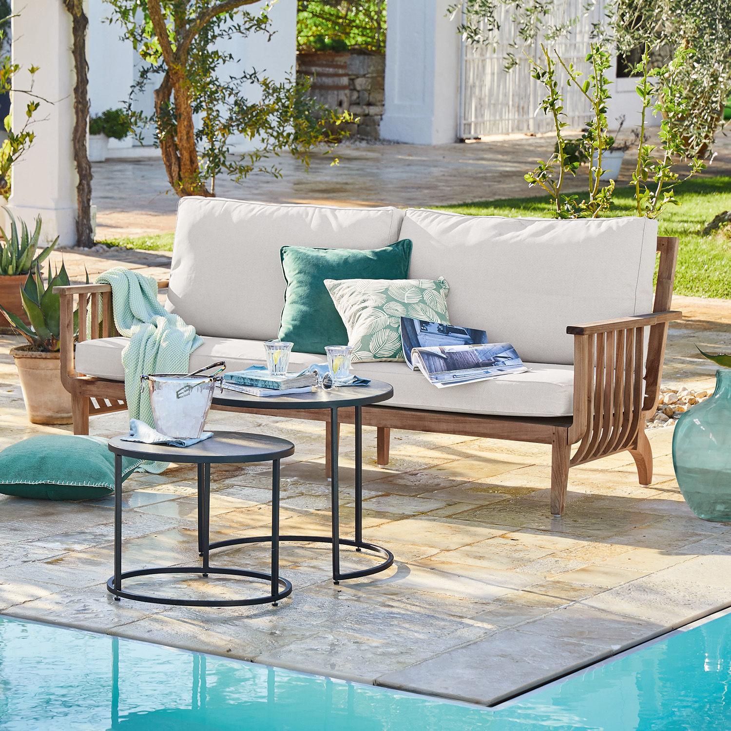 Outdoor-Living – dieser Trend bleibt nicht nur unverändert aktuell, er erlebt gerade eine erstaunliche Weiterentwicklung. Denn immer mehr Wohnmöbel-Designer widmen ihre Entwürfe dem Leben unter freiem Himmel. Was zu nicht nur optisch interessanten Kreationen, sondern auch zu funktional neuartigen Kombinationen führt. Für dieses Sofa wurden zwei Outdoor-Spezialisten zusammengebracht, von denen der eine ein bewährter Profi, der andere ein echter Newcomer ist. Zusammen werden sie dafür sorgen, dass die schönen Sommertage und die langen Abende auf der Terrasse für Sie noch ein bisschen komfortabler werden. Der bewährte Profi ist das Teakholz, dieser schon legendäre Klassiker für hochwertige Outdoor-Möbel, der seinen Platz als Nr. 1 immer noch erfolgreich behauptet. Denn kein anderes Holz kann es mit ihm in puncto Widerstandfähigkeit gegen Sonne, Regen, Frost, Schnee und sogar Schädlinge aufnehmen. Das Beste aber: Teakholz altert edel, das heißt, es bekommt im Laufe der Jahre eine silbergraue Patina, die jedes Teakmöbel noch charaktervoller macht. Für das besondere Wohlgefühl auf dem Sofa sind aber eindeutig die Polster aus der modernen Kunststofffaser Olefin verantwortlich, die ebenfalls UV-Strahlung wie Dauerregen ungerührt über sich ergehen lässt. Was Sie aber besonders an den Polstern schätzen werden: Sie haben große Ähnlichkeit mit natürlichem Baumwollgewebe und verleihen so dem Sofa die angenehm wohnliche Note.